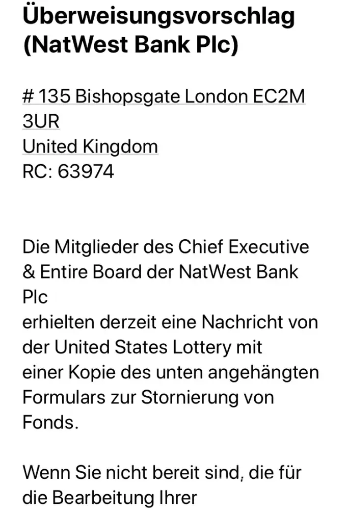 Good day and welcome to the national westminster bank, where everything we do is all about you. We have been mandated by the uk national lottery to transfer the sum of £5, 000, 000.00 gbp to your designated bank account. This sum will be transferred into your designated bank account, as soon as you make a security deposit for the cost of transfer.