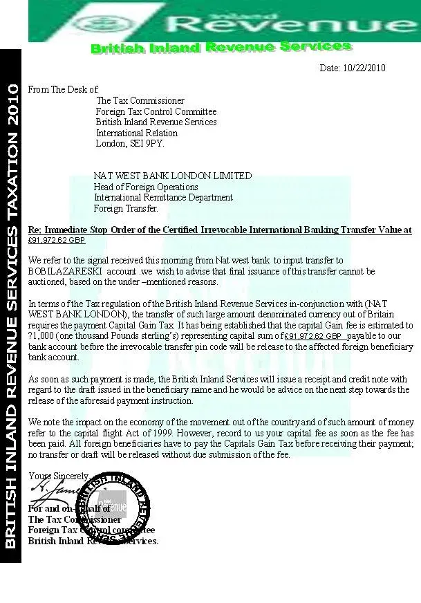On the 18-th this month(oktober), received na waiting email, from bank that expecting ammount of money will be transfered to my bank account, in which i was noticed that the ammount of about 99.000, 00 pound in sterlings will be transfered to my account. On 22 of October, checked in bank, and informed that the ammount of money is not on my account. Than...