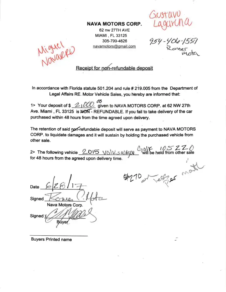 On June 28th, 2017, I paid a cash deposit in the amount of $2000 for a 2016 Volkswagen Golf with VIN #: xx5220 which I was given a receipt for along with the promise that my monthly payments would be under $270 and I would receive a call the following day with the exact monthly amount and the time I should arrive to sign the paperwork and pick up my car. Upon my return to the dealership, I was informed that Nava Motors was unable to get me satisfactory financing so instead of the 2016 Volkswagen Golf they had a 2006 Pontiac Mustang that they were going to sell me instead.