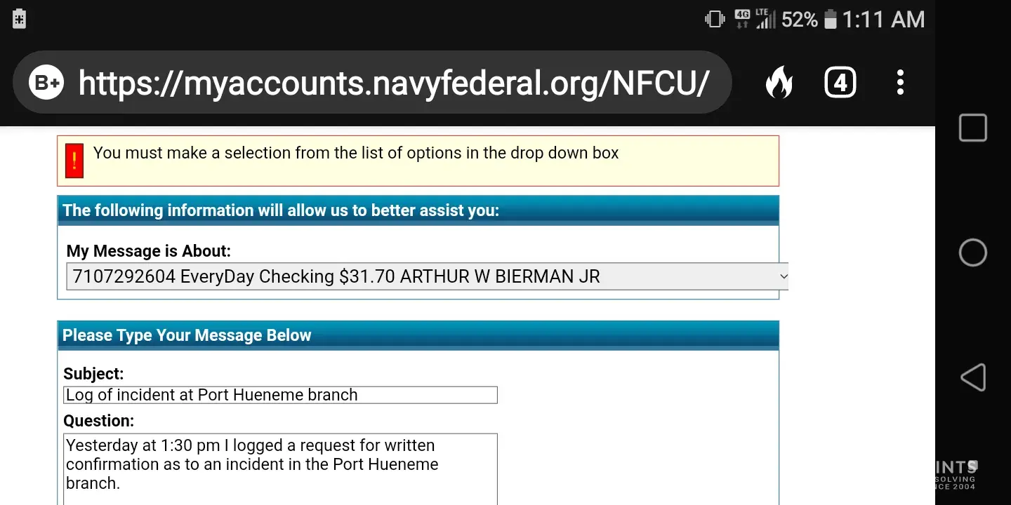 Yesterday at 1:30 pm I logged a phone request for written confirmation as to an incident in the Port Hueneme branch.