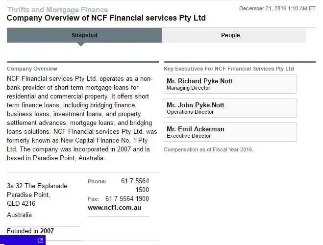 If you are considering dealing with Emil Ackerman, John Pyke-Nott, NCF Pty Ltd, NCF Commercial Lending, NCF Finance or any company linked to the two men please ring [protected] for a completely free appraisal of what dealing with these people means.