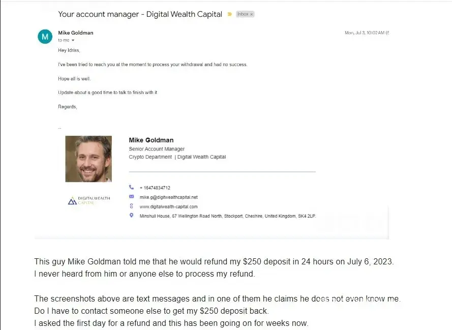 I have been trying to get a refund since the day I talked to Mike Goldman on June 29, 2023 (date of transaction). I still have not received one for the $250 deposit. I changed my mind the same day he took my $250 deposit. Mike Goldman and his supervisor told me over the phone there was no problem to get a refund, but still would not give me one. The last...