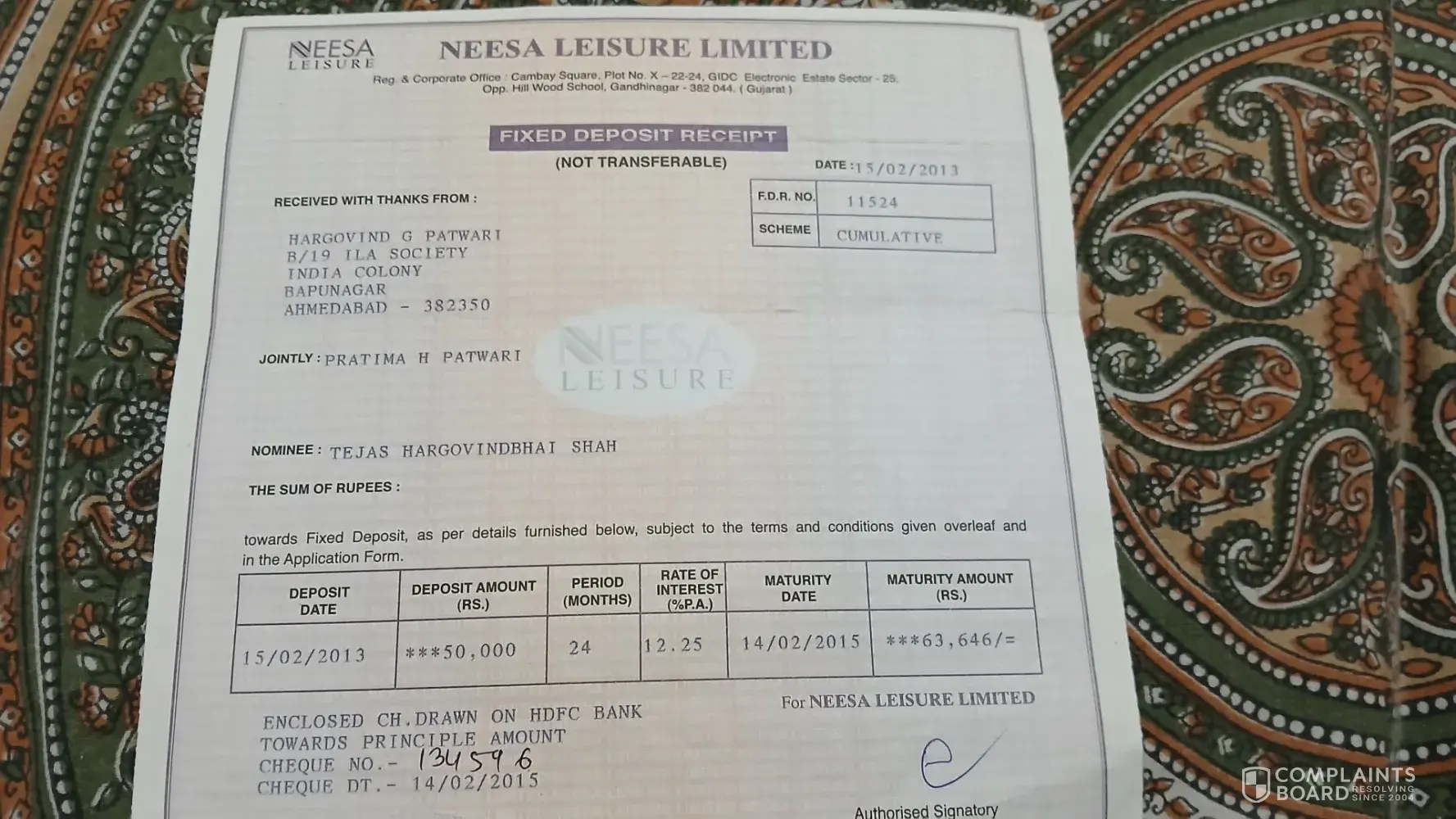 Non payment of fixed deposits payment by Company NEESA LEISURE LTD, Gandhinagar. Company has Indulged in cheating and fraudulent activities. we had submitted the FDR’s to the company for the repayment. Instead of repayment, the company of its own has renewed all the below FDR’s for a period of additional six month. In the company’s brochure of fixed deposit...