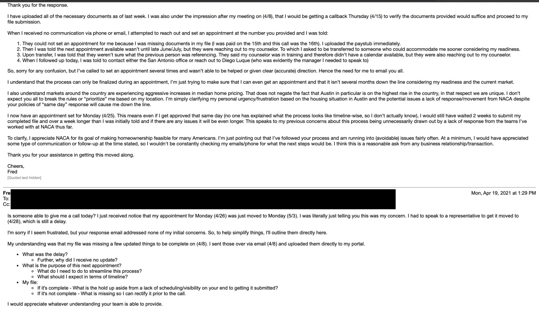 To clarify, I appreciate NACA for its goal of making homeownership feasible for many Americans. I'm just pointing out that I've followed your process and am running into (avoidable) issues fairly often. At a minimum, I would have appreciated some type of communication or follow-up at the time stated, so I wouldn't be constantly checking my emails/phone for what the next steps would be. I think this is a reasonable ask from any business relationship/transaction.