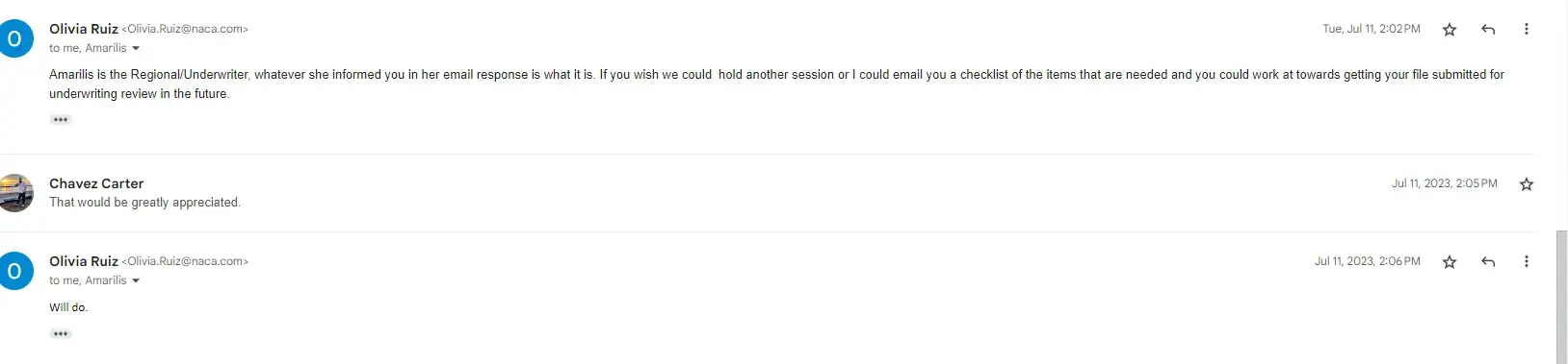 If you have anty complaints about the NACA process or any issues obtaining the information you need please submit your NACA id # as well as a detailed explaination of your issue to [protected]@naca.com . I will address all concerns and make the NACA experince a experince that you will never forget . Our goal is to provide excellent leadership and customer service while educating you on home ownership . Have a great day !
