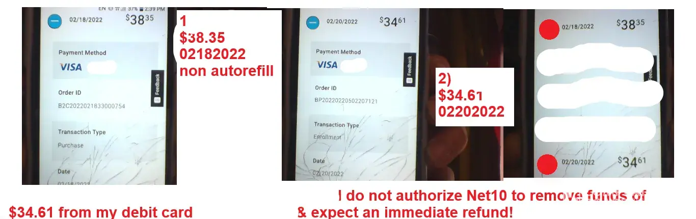 On 2/18/2022 $38.35 charge to my visa On 02/22/2022 unauthorized charge from my other visa This card expired The info was entered on the expired card was false On 02/18/2022 I renewed my wireless service for auto renewal The system didn't take it On 02/20/2022 I contacted net10 again requesting refund so I could pay for the plan that I initially requested After 1.25 hours of waiting on hold, they informed me that they would transfer me to a CSR for refund After another half hour that person argued with me for more than 30 minutes denying the second charge & refusing refund He simply just added another 30 day plan & added false inform. On my expired visa & pushed the sale through! I've been calling for weeks My financial institutions are piling on the over draft fees My bills cannot be paid because my account is now locked, I recognize their voices at this point. They were simply transferring me back & forth between each other, literally lying the entire time. I did groceries, went to my financial institution & library during a 4 hour phone call, only for it to end in "you need to contact your bank" The person kept repeating the same phrase every 20 minutes to keep me on the line. I've got more than a decade of call center experience, working as the quality assurance supervisor... There are so many FCC regulations that are being violated that they could be shut down. The US office isn't being forth coming with their US consumers who don't know their calls are being routed to Columbia! Who doesn't follow the FCC consumer protection act, evidently? Very discouraging