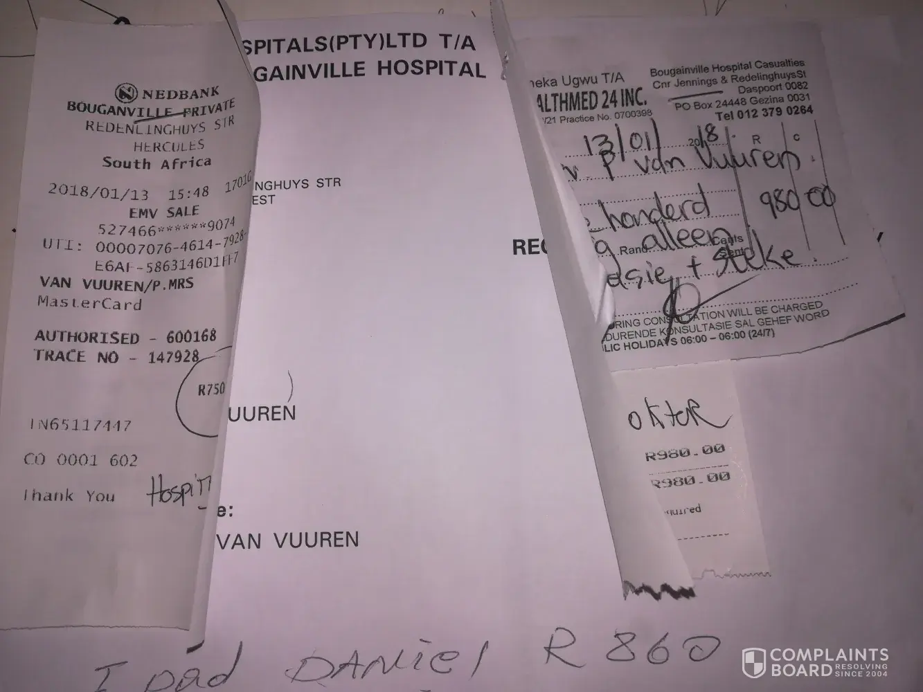 A week later my wife gets a call from the doctors office who was treating my wife at the hospital been informed that she will be charged R750 for sending the letter which we were fine with. Thinking the matter was sorted to my shock I recently receive a hospital bill of an outstanding amount of R11000 I then call the medical who informed me the letter was never received by them, so now fingers are been pointed in different directions and not even one person is willing to assist.