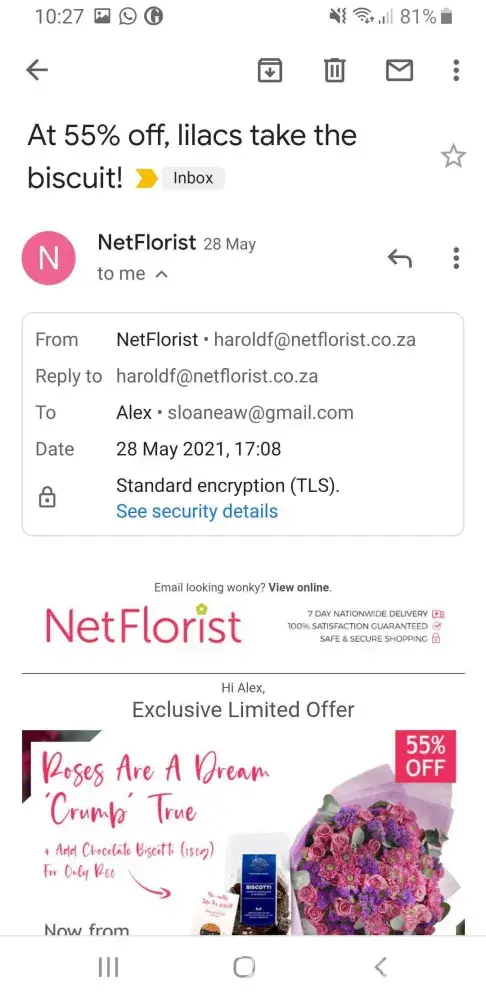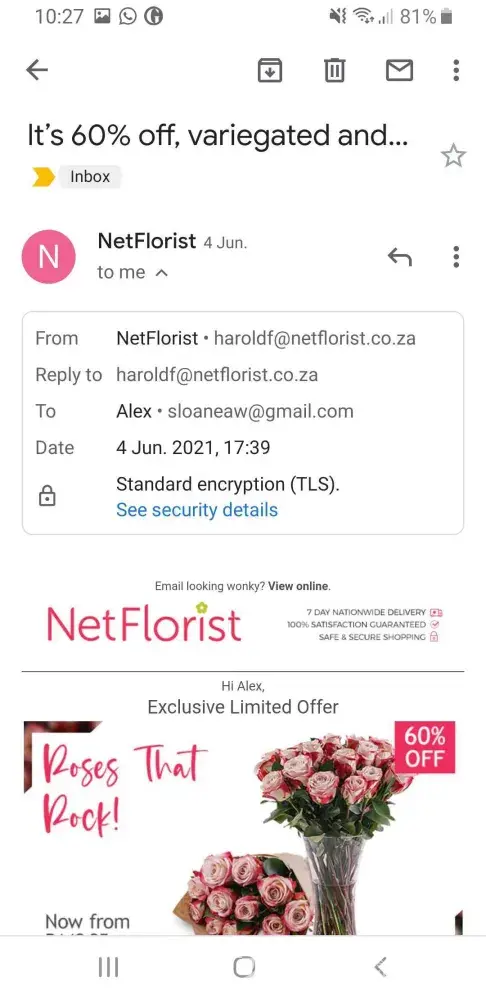 I opted out from receiving emails from the NetFlorist website on 2 occasions and replied to emails from the company requesting to be unsubscribed, most recently in the middle of May. Since this time I have received more than 8 emails from them (only 8 saved in my inbox at the moment). I would like to be removed from their mailing list and for them to be fined for their breach. Email address [protected]@netflorist.co.za