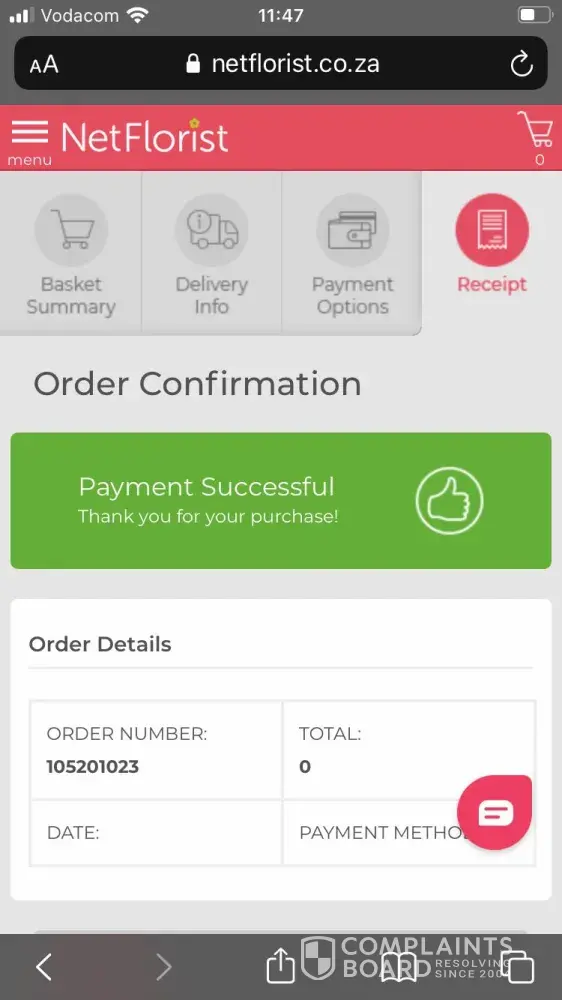 I placed an order for a 24-rosey bouquet to be delivered to my mother for her birthday. I paid R780 for the bouquet + delivery charges. This bouquet and one other item was to be delivered on 30 April.