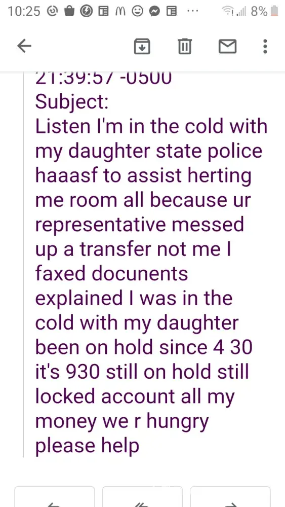 My account was working fine I just got a $700 deposit on my taxes I went to McDonald's me and my two-year-old daughter got dropped off to buy a car it would not let me transfer money so I called them and she said I was doing it wrong that I had to transfer 250 but she was like sir I can do it for you over the phone well she did it and she messed up and it locked my account so I sent the title to my car I sent my ID I gave them all the information I possibly could have gave them and the guy was very rude and hung up on me and I spent from 4 till 9 trying to get ahold of somebody just to be constantly hung up on me and while me and my daughter are stuck with no money out in the middle of nowhere freezing cold during a pandemic thank God the state police help us get a hotel room through a charity group I'm in the hotel room tonight they better have my money unlock tomorrow