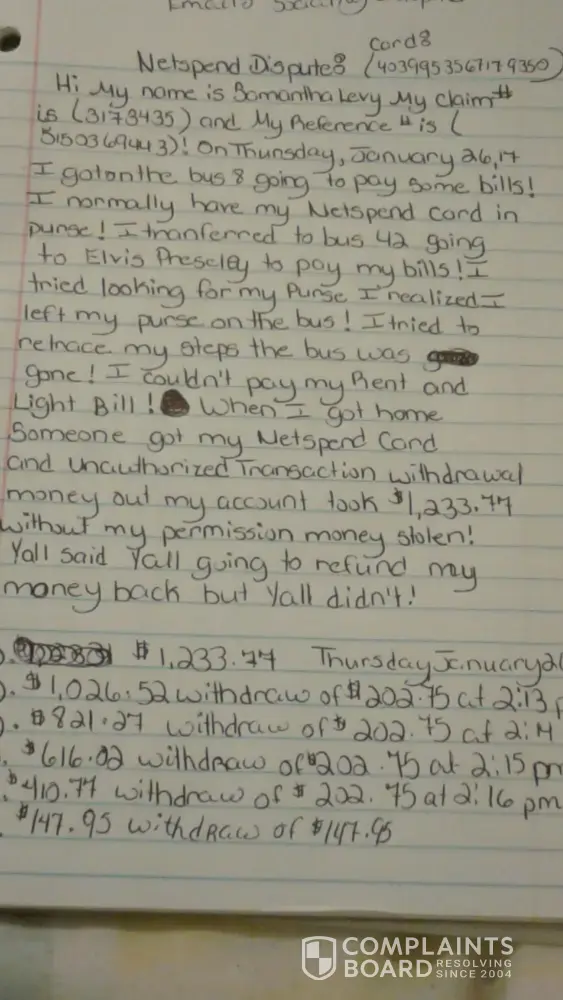 My name is Samantha Levy And my claim #( 3173435) And reference #([protected])! On Thursday, January 26, 17 I got on the bus 8 going to pay some bills! I normally have my Netspend Card in my purse! I transferred to bus 42 going to Elvis Presley to pay my bills! I tried looking for my purse I realized I left my purse on the bus! I tried to retrace my steps the bus was gone! I couldn't pay my rent and light bill! When I got home someone made Some Unauthorized Transactions money from my account without permission! $1, 233.77 was stolen from my Netspend Card account! Y'all said Y'all going to Refund my money back I still haven't gotten my money back from Netspend!