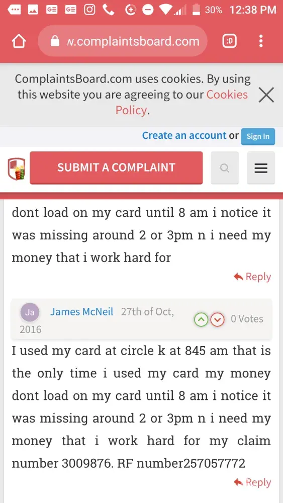 I used my card at circle k at 845 am that is the only time i used my card my money dont load on my card until 8 am i notice it was missing around 2 or 3pm n i need my money that i work hard for my claim number 3009876. RF number257057772