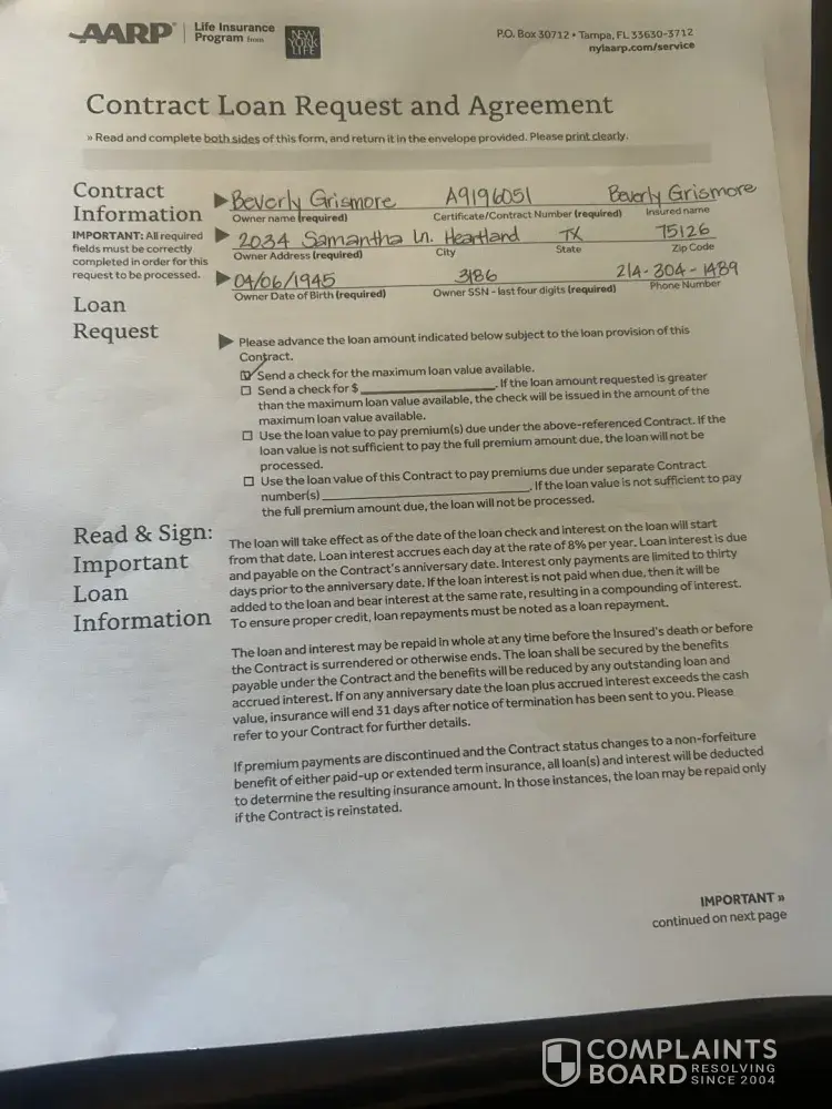 At the beginning of this month, I spoke with the AARP Life Insurance Program to make a loan against my whole life policy. I was making the loan because we had a death in the family and their policy was not enough for their burial. I was told they would send me the documents to start the process. After a few days, I called back, found the documents online...