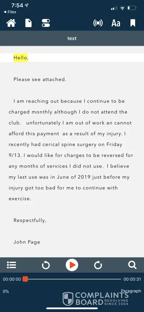 Hello, Please see attached. I am reaching out because I continue to be charged monthly although I do not attend the club. unfortunately I am out of work an cannot afford this payment as a result of my injury. I recently had cerical spine surgery on Friday 9/13. I would like for charges to be reversed for any months of services I did not use. I believe my...
