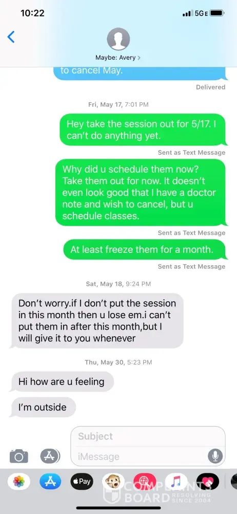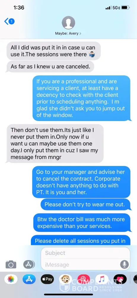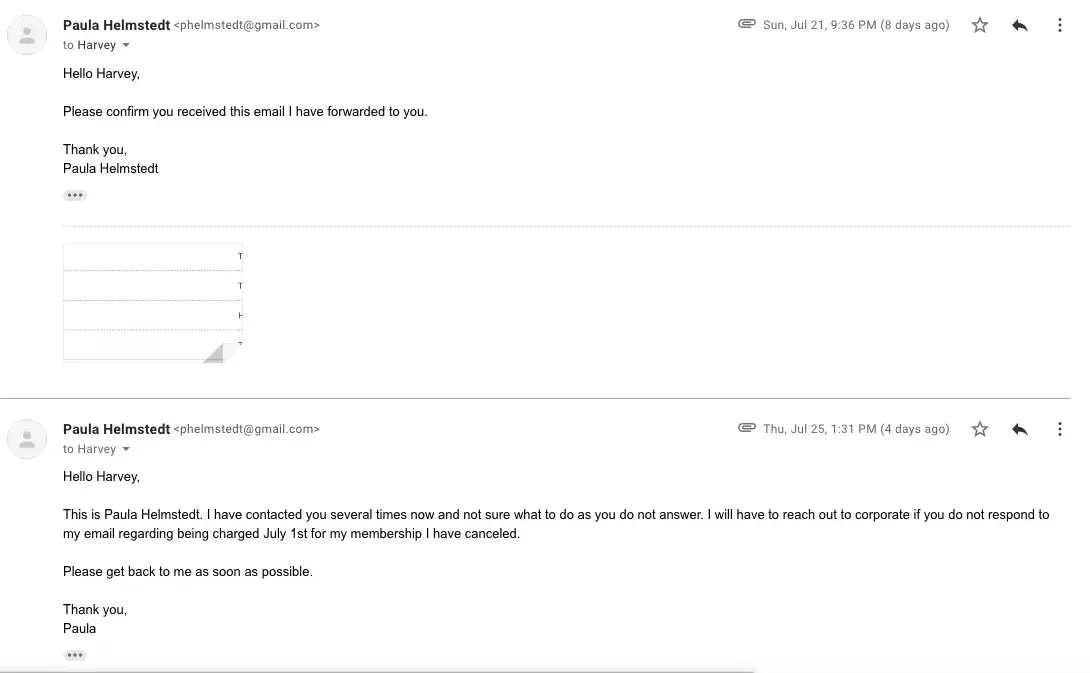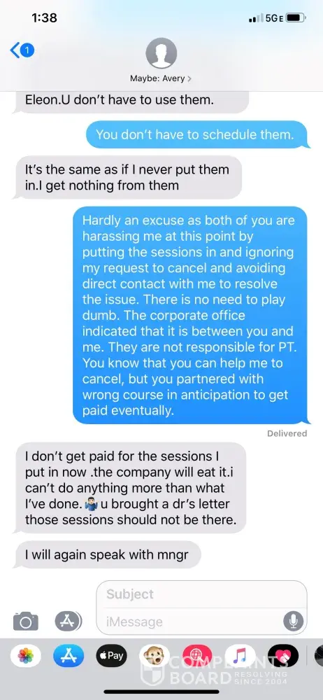 As of today the local club at 26 Court street in Brooklyn continuously is scheduling PT sessions without talking to me and I am unable to stop them. It is now become a complete harassment and extorsion pattern. I called the manager and she refused to hear me saying that doctor didn't tailor the note to comply with the corporate policy for PT cancellation. I called corporate office and they told me they have nothing to do with PT. It is all between the PT and local manager and they both act as it is up to corporate. This all looks like one big scheme. Please see all communication with PT and the same communication took place with the local manager Melissa Dobles.
