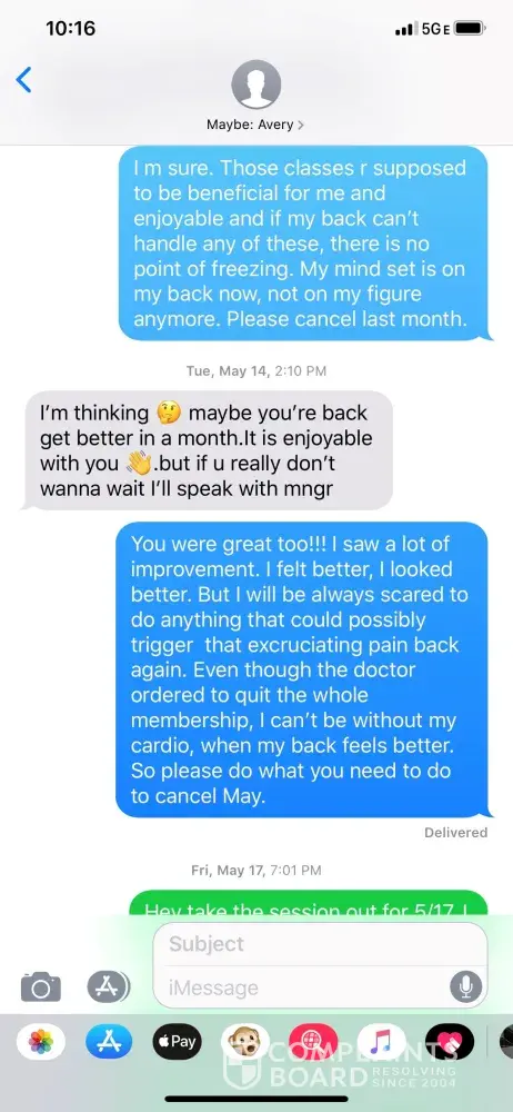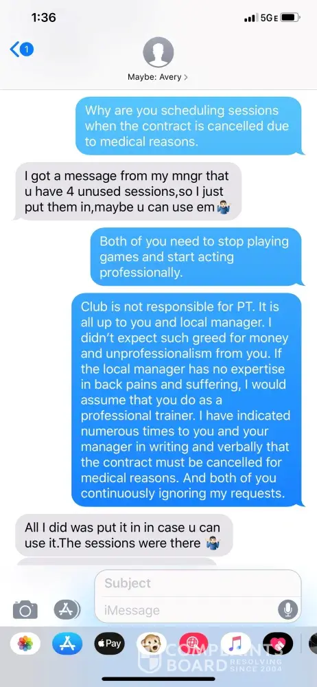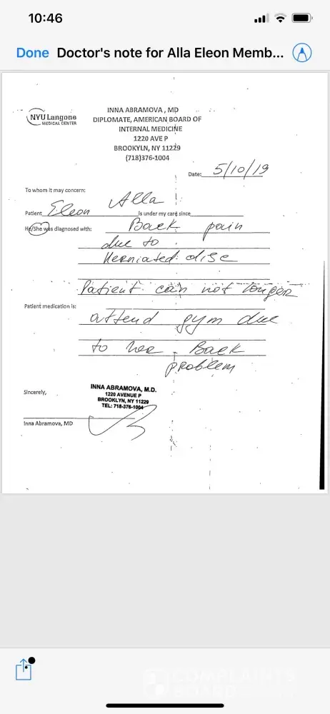 My client ID #9041433. The PT was after me for a while to get a Personal Training services. For a month I was trying to avoid the guy telling him that I have numerous back problems and that the services are very expensive. Then Abraham Schwartzberg caught me in April saying that there is a sale on PT. I gave in and purchased a 3 months contract for Personal Training. I have advised the PT that I have back problems. He told me himself that he can see it for himself, that my back is very weak. First month all 4 sessions, I was arguing with him bringing trying to reduce the waits size or refusing to do certain exercises. Which made me wonder who is the professional here? The contract was signed on April 28th and my card was charged for the first month of the contract. Everything went well for the first month. Then on April 28th the 2nd charge was made on my card and I took 2 more sessions. After that 2nd session on May 6th my back got hurt. Since may 7th I was in contact with Mr. Schwartzberg advising him on the status and pleading to cancel. Then I was trying to reach the manager for a week to provide her with the doctors note and my request to cancel. However, my card was continually charged and my numerous requests to cancel were ignored. I had no choice but to dispute the remaining amounts under the contract with the credit card. And while this dispute is in works, I saw last night on June 20th that PT scheduled other sessions that I can't take due to the medical reasons. Communication with PT is attached. Cancellation request along with the doctor's note is attached. I already have a bill from the doctor, if you need it. Please help me to cancel the contract and rectify the situation with the charges for not fulfilled contract.