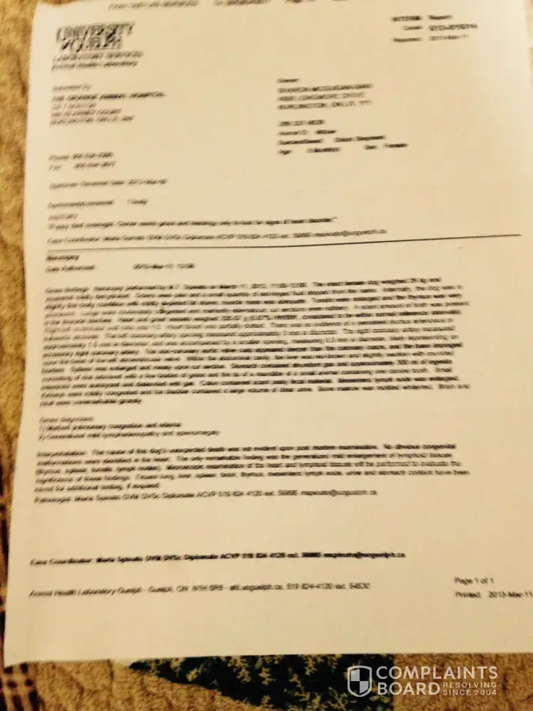 I called our vet who told us to take her to have autopsy done which we did.