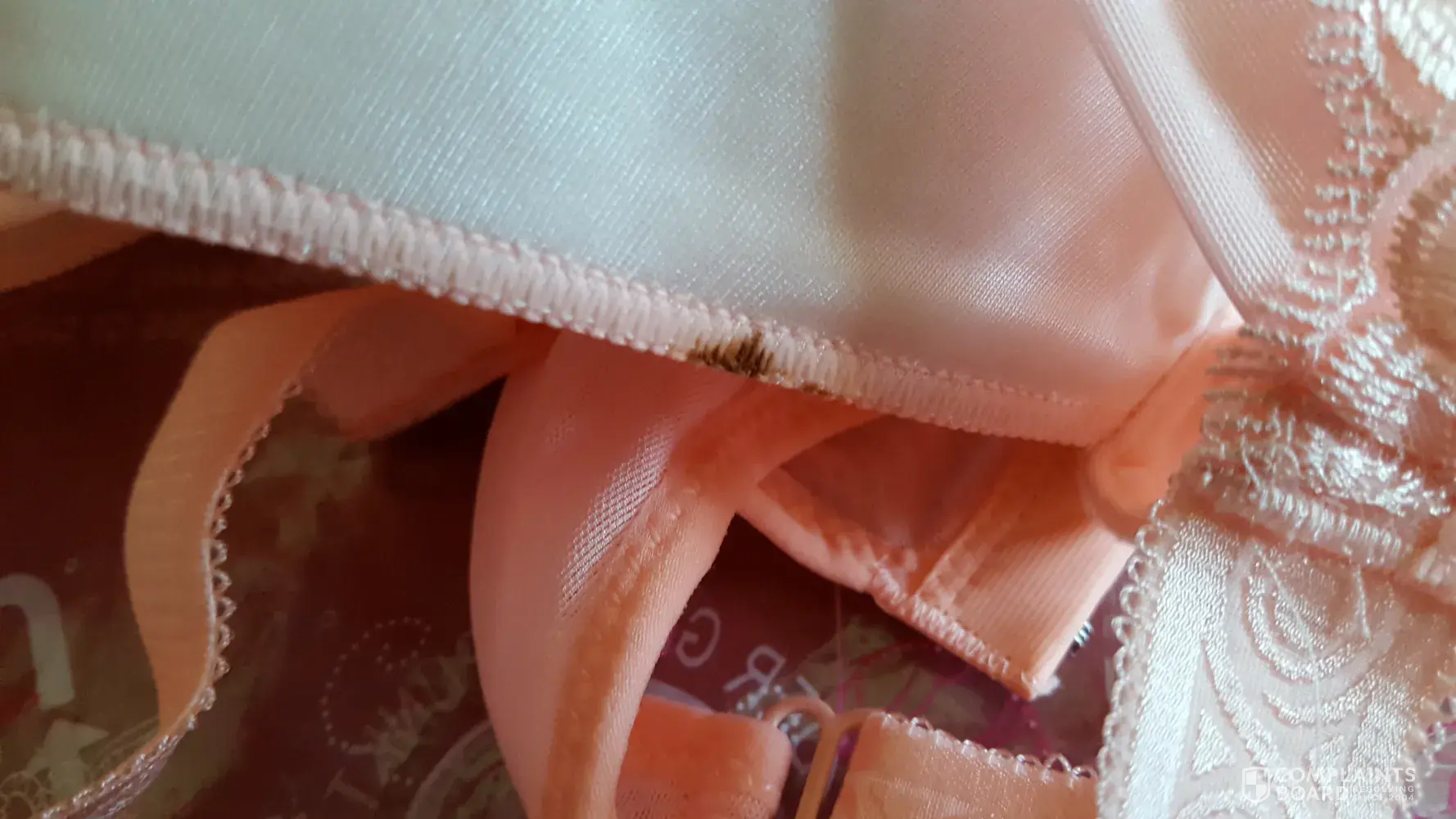 I purchased 2 bras, one shown in photo. Has stain on it. It did not come with packing slip or any way to return it. I do not still have outside packaging or order number. I sent photo with sku # from product packaging and tag on product. I would really like to return and or replace product. Please advise on how this can be accomplished.