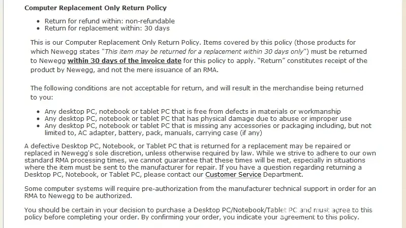 I spent close to two hours researching the item on newegg.com, including reviews, as well as their"computer replacement policies."the first thing I noticed was their"no refund"policy. While I thought this was an odd policy considering other online stores such as amazon allow for refunds (Minus a 15% restocking fee, but a refund none the least), I didn't let it sway my decision as I was dead-set on the model I wanted, and did not forsee any reason why I would want to return it for a refund. I then reviewed their"computer replacement policy"which is actually separated into two sections -"computer replacement return only"and"personal computer replacement". The policy was fairly typical of most online retailers, nothing out of the ordinary. So I went ahead with the purchase.
