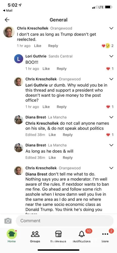 I have been sent multiple notes to watch my post and was block for two weeks for arguing. The problem is they do not treat Liberals the same. I have received multiple horrible and vial comments and threats, which I reported. Yet Nextdoor continues to allow those individuals to post freely. This website is nothing more than a cesspool of people trolling and attacking opposing views. Something needs to be done.
