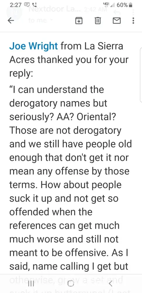 Consider this a complaint against the Nextdoor Officials who sent the threat and suspended me. Either they did not request to see my so called offensive entries or they knew the complaint against me was false and they assisted in facilitating this false complaint.