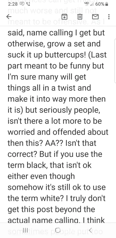 I also looked up information based on politically correct terms that are acceptable and not listed as derogatory terms and the term AA and oriental is still considered acceptable terms. The original post of Mary Troup is attached along with my response that was removed and apparently the reason I was banned for 3 days. 5 images in total. I would like an explanation please about why I was singled out as wrong when she is the one who brought up the terms and the comment in the first place?
