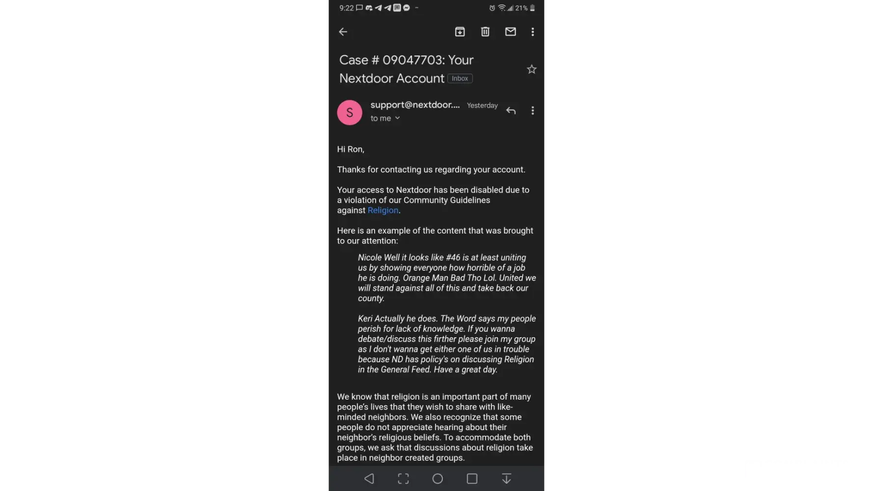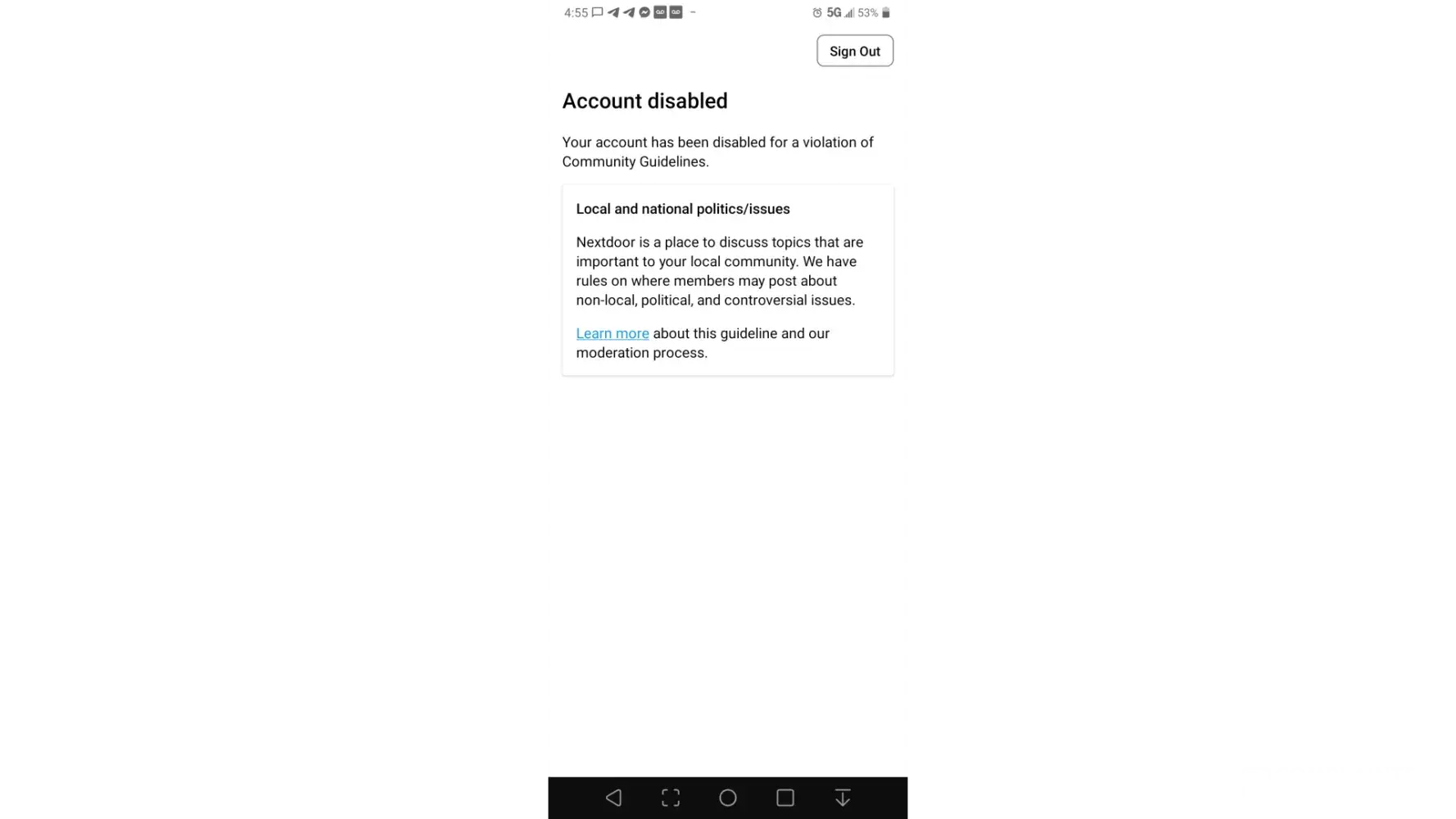Your access to Nextdoor has been disabled due to a violation of our Community Guidelines against discrimination.