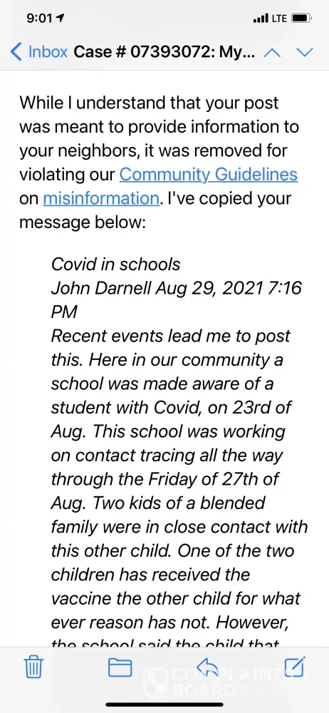 My post was about an event that took place at my kids school and dealt with Covid. I will include some pictures of what next door said as to why my post was removed. Even though I supplied evidence from the cdc.gov website. They responded with my post was misleading. All of the events I mentioned in my post actually took place and is still an on going event. My daughter was made to quarantine and get a covid test. While my step son is still in school because he has received the vaccine shot. Even though the cdc says he can still spread covid. As per the link I provide for all of nextdoor users and for nextdoor to review