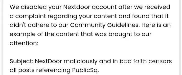 NextDoor engages in vicious, Orwellian censorship of users. The mere mention of their competitor, PublicSq. results in swift post removals and bans.