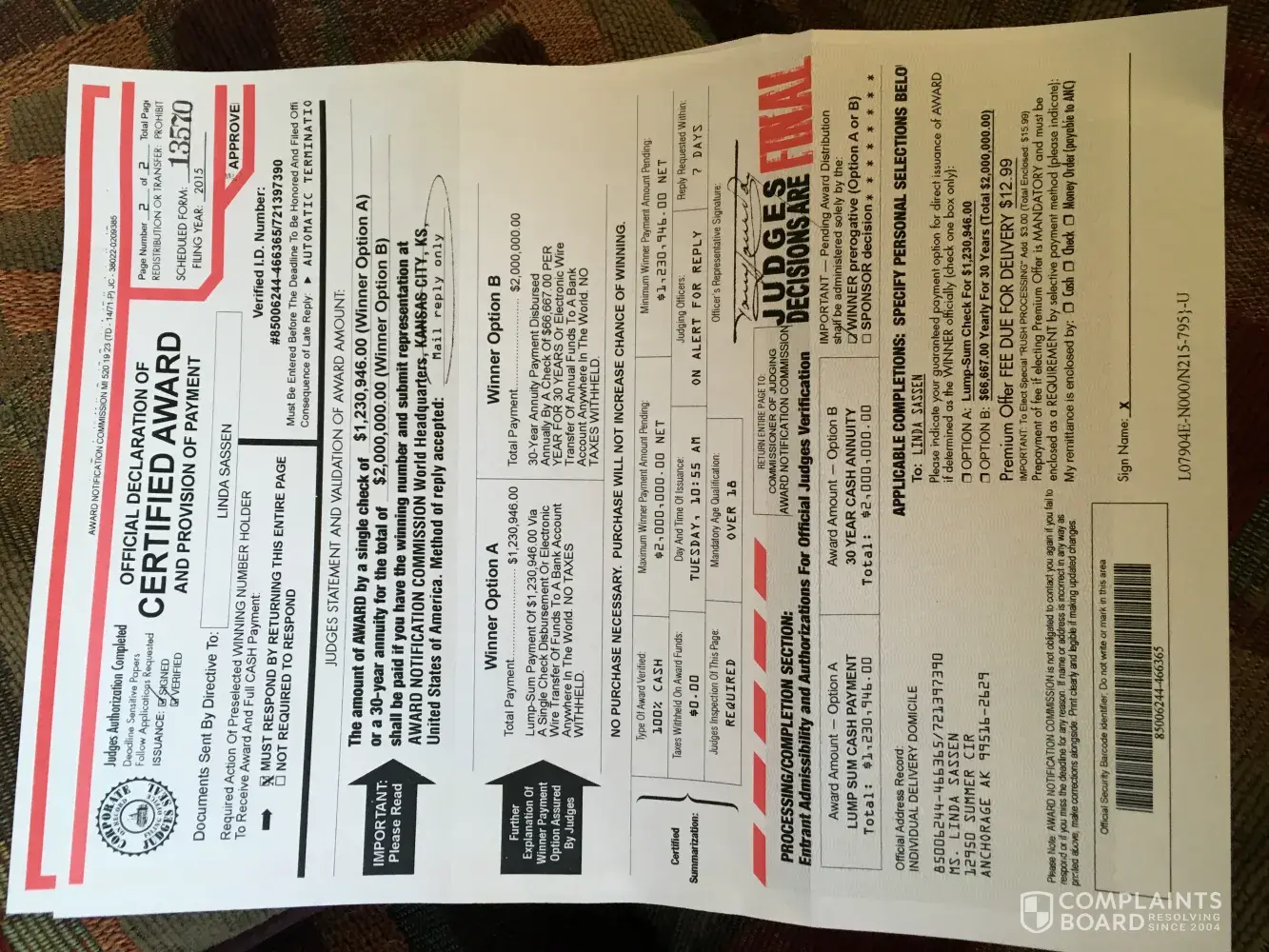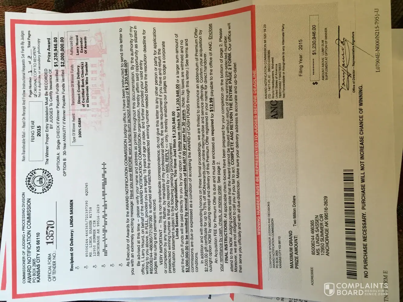 Wonrewards.com/ official letter stating I have won $1,230,946