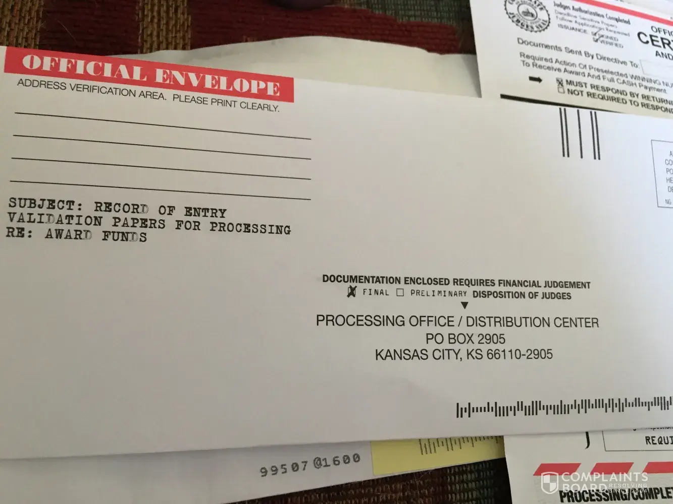 keep receiving letters from Kansas City about Award Winnings that I have won. These type of letters are mail fraud and need to be stopped and punished. So many people are in financial binds and this gives them such hope of being a winner. This one that I am reporting is asking for a fee of $69.99. Their address is Directors's Office, PO Box 2905, Kansas City, Kansas, [protected].
