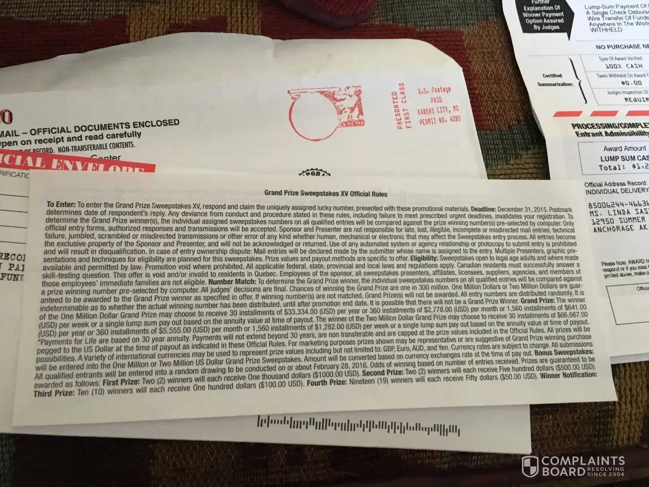 They are sending their sweepstakes info, in the same type of envelope and printing as Publishers Clearing House Sweeps. Leading one to think it is PCH and you need to send them 11.89 calling it an Award Notification Commission. Another scam. When I called the phone number, they told me it was for some misc merchandise, could not tell me what kind of merchandise. It is not the amount of money, it is the principle, they are receiving the 11.89 from hundreds or thousands of people. It works out to a lot of money for them and the joy of knowing they screwed a lot of innocent people. I don't know about the other people, but I am sick and tired of getting screwed. but these thieves. My suggestions is to send back any and all sweepstakes offers, and let them eat the postage..