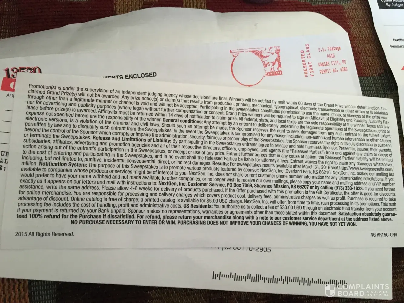 I received one of these letters two months ago (2015), from next gen "notifying" me that I had won 2 million dollars. The catch: a Mandatory FEE of 11.89 to collect my "winnings." If I wanted rush processing, it would cost another 3 dollars for a total of $14.89! What a ripoff! There have been hundreds of complaints about the scams this company continues to run. Why is it still allowed to do so? This "sweepstakes is a scam on so many levels. Not just the Mandatory FEE, but at one point in the letter it states that no purchase is necessary and will not increase a person's chance of winning. If that's true, why is there a Mandatory FEE to collect the money? Pressure must be applied on the LEGAL SYSTEM to shut down this scam permanently. Now. Right now. SOCIAL MEDIA can do the trick. Anyone paying attention? Post on Facebook, twitter, and all other SOCIAL MEDIA. Lets get busy. You could be the next victim or someone in your family or someone that you love...