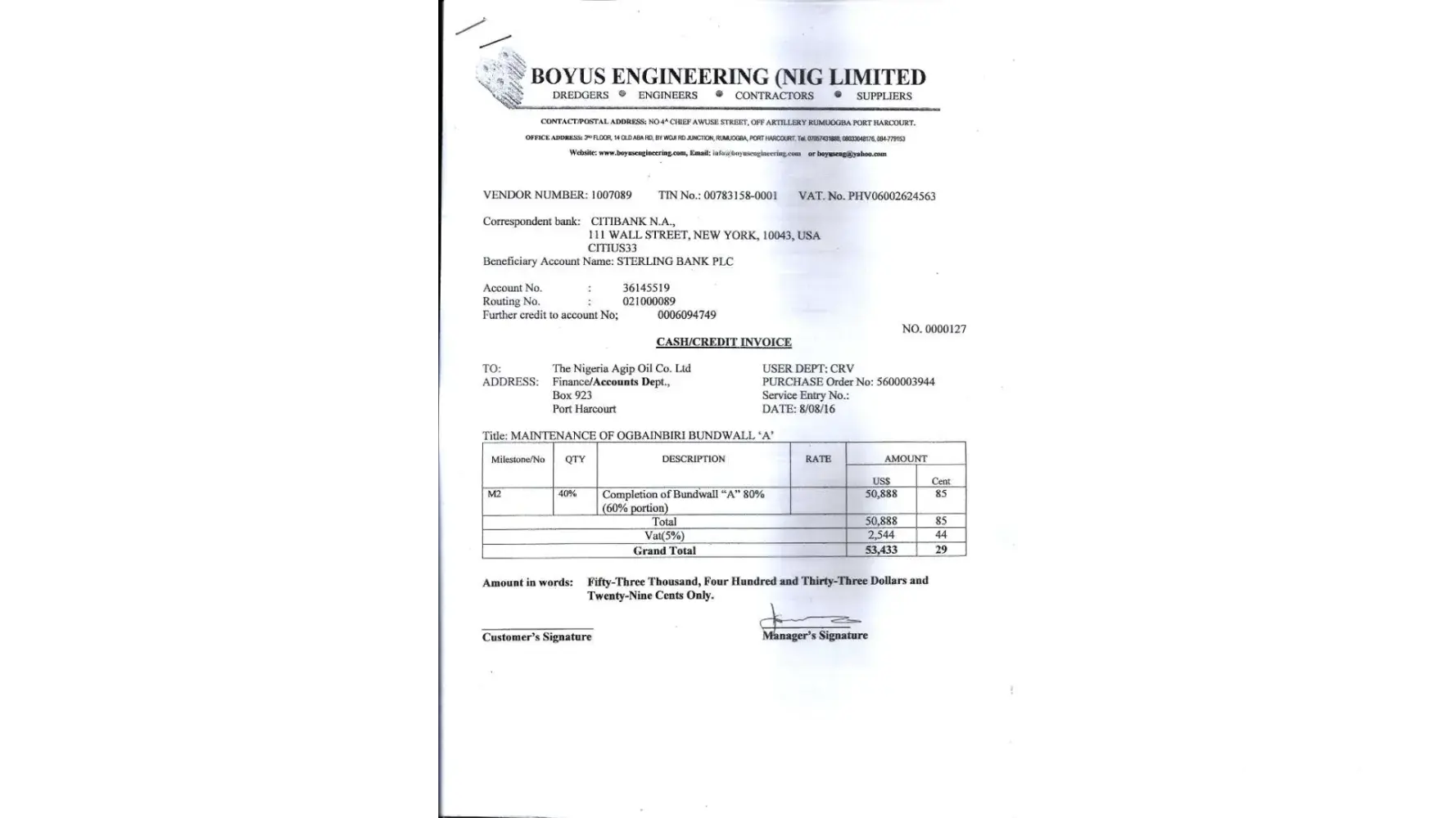 I received a Contract Agreement from Nigerian Agip Oil Company Limited Incorporated in Nigeria – RC 2974