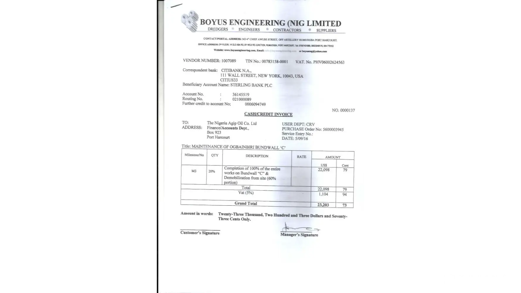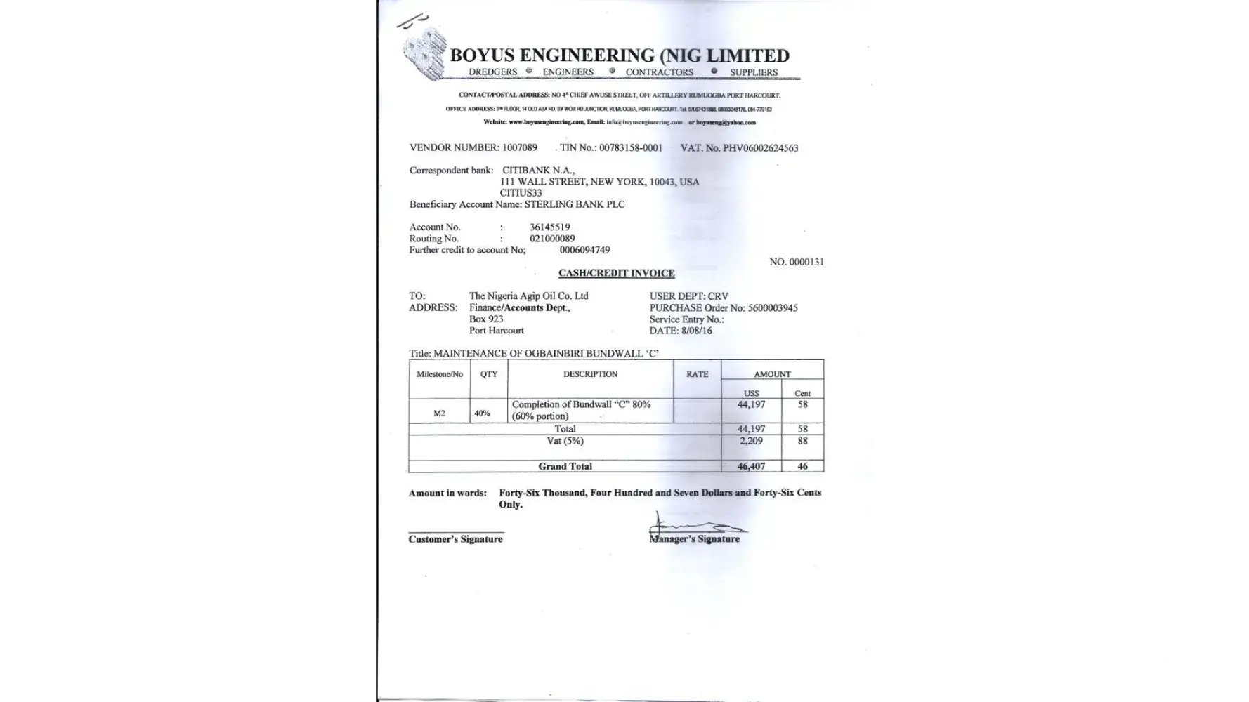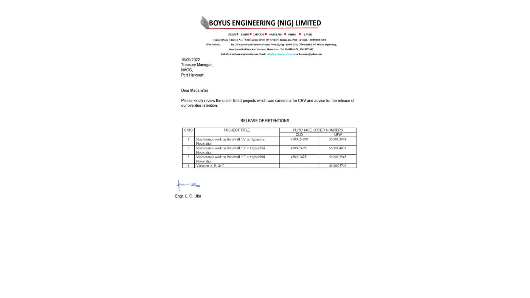 Our company Boyus Engineering Nigeria Limited executed a contract for the Maintenance of Three Cells of Ogbaimbiri Flowstation Bund wall for your CRV department. All payments were received by 2017 but the retention was held which is normal. After the expiration of the six months retention due date, we applied for the release, and the Naira portion was released but the Dollar portion was still being held.