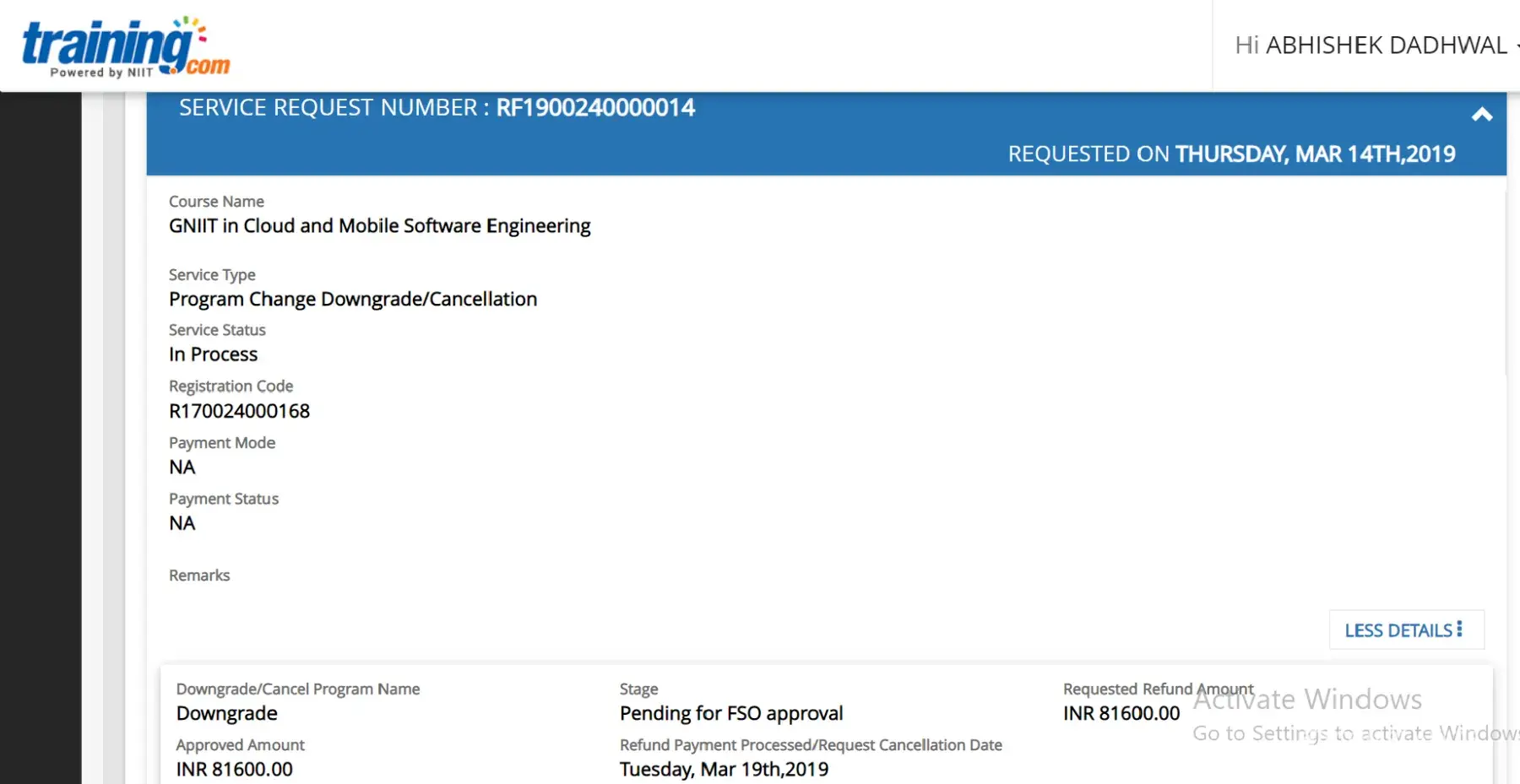 I am Abhishek Dadhwal, Id S170024000109, with registration number R170024000168 studying GNIIT at NIIT. I requested for downgrade of my program to 13 months, i.e., DIPSE from GNIIT on March 15th /2019, my application number is RF1900240000014. Some other students from my branch did same and their request was accepted within a few hours but on the contrary, my request is still pending for FSO approval. On 19th March I received a mail from customer care stating "Your escalation with Reference ID [protected] has been acted upon and responded on Mar 19, 2019, with a solution" but still my status on my account is pending. Moreover, according to my centre, they can't see any request at their system and asks me to submit the request again. But according to the NIIT website, we can't request again for the same until our previous request is still active. I have given various emails at Niit Customer Case as on 24th March, 30th March and 3rd April but haven't got any response yet. It is almost a month since my first request for FSO approval. I completely understand these things take time but it is still showing "waiting for FSO approval". If possible please give details of your FSO so I could contact directly and ask for the reasons for such a long delay without any reason. I have also contacted my current branch but according to them they are also not getting any reply from your side.