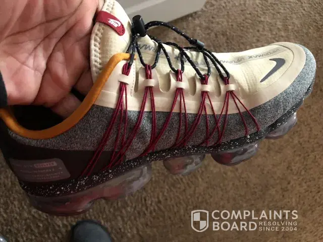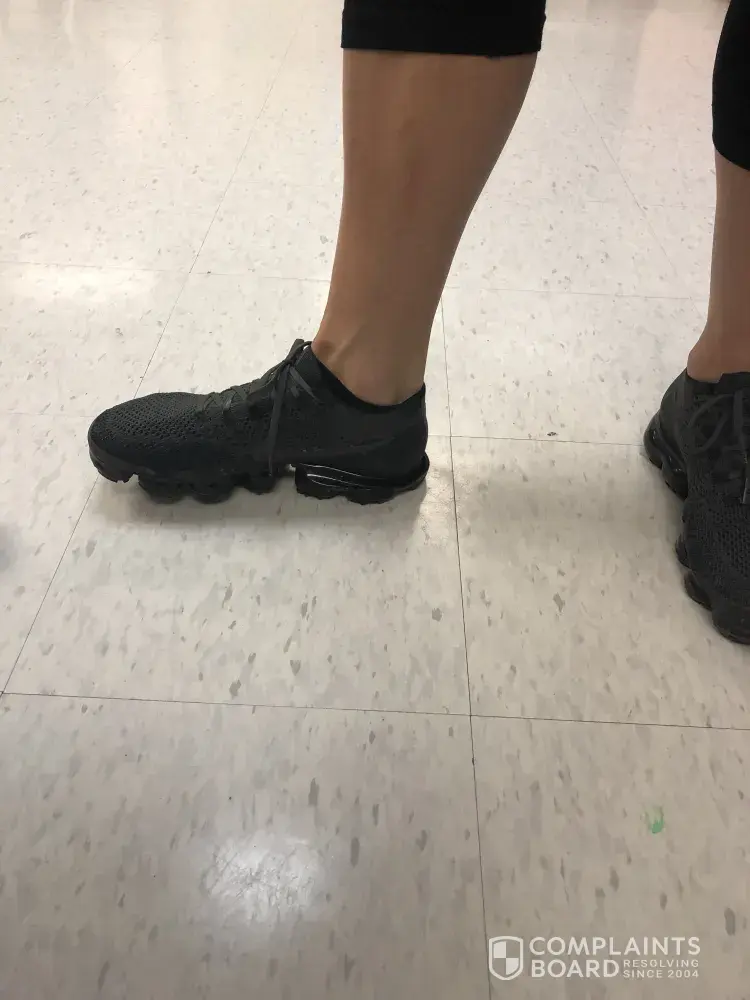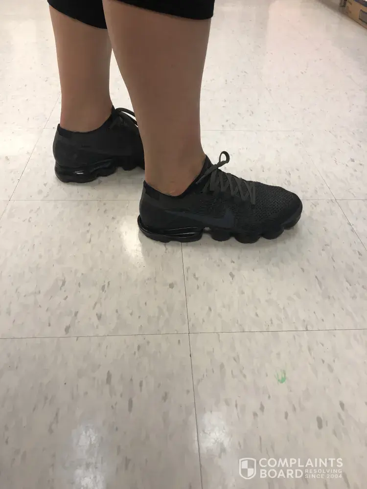 Hi, My husband bought me this pair Nike VaporMax for my birthday in October 2018. I still had a pair of Nike shoes that were in good shape for running so I kept these until those were a little more beat up. I wore them to the gym yesterday and the back bubble on my right heel must have a small hole in it. When I push down on my right heel I can hear air being released from the shoe and my heel touched the ground. I am unhappy because I haven't even gotten to experience the shoes because they cant be worn like this. I am an avid runner and there is no way that I can run in these shoes. I have attached images of the shoes, their condition and a visual that the heel is actually popped. I would like a refund or an equal amount to be able to buy another pair of shoes.