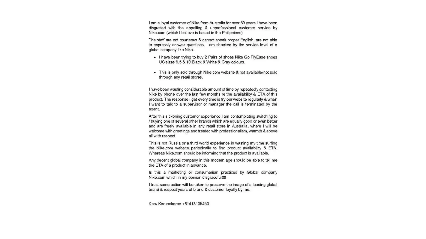 I am a loyal customer of Nike from Australia for over 50 years I have been disgusted with the appalling & unprofessional customer service by Nike.com (which I believe is based in the Philippines)
