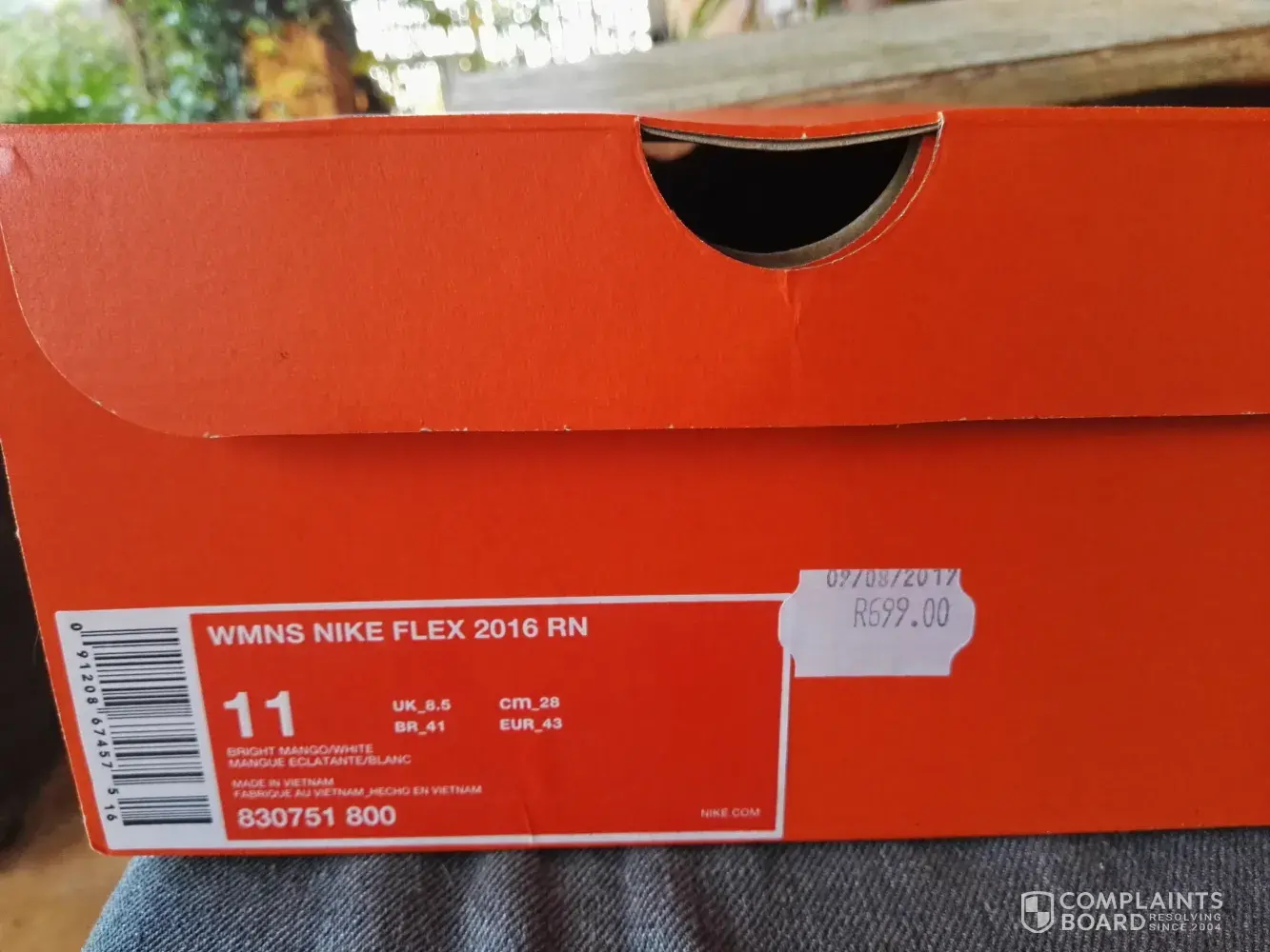 3 weeks ago I received a pair of WMNS Nike Flex 2016 RN from my parents and i wore them for the second time when they tore. I was running and the shoe scrapped along the side walk and tore. This is anaccpetable. They are running shoes and should not be this fragile. I attacted a photo. I am very upset about this and hope that my complaint will not fall on deaf ears. As it was a present I do not have the slip but i still have the box. The shoes were purchased at the Nikr outlet in Atterbury Pretoria. Unfortunately I cant bring them back as I live in Tzaneen, Limpopo.