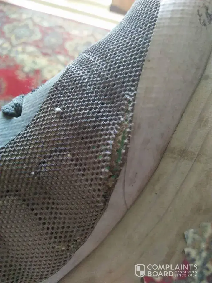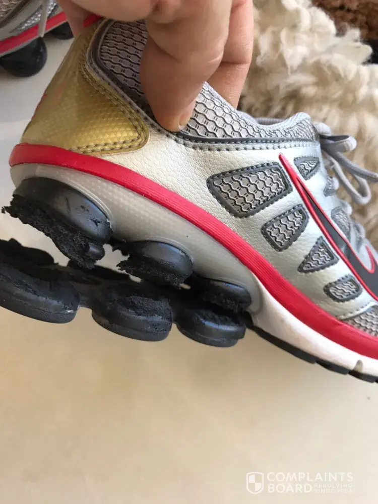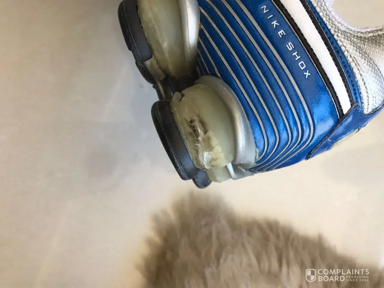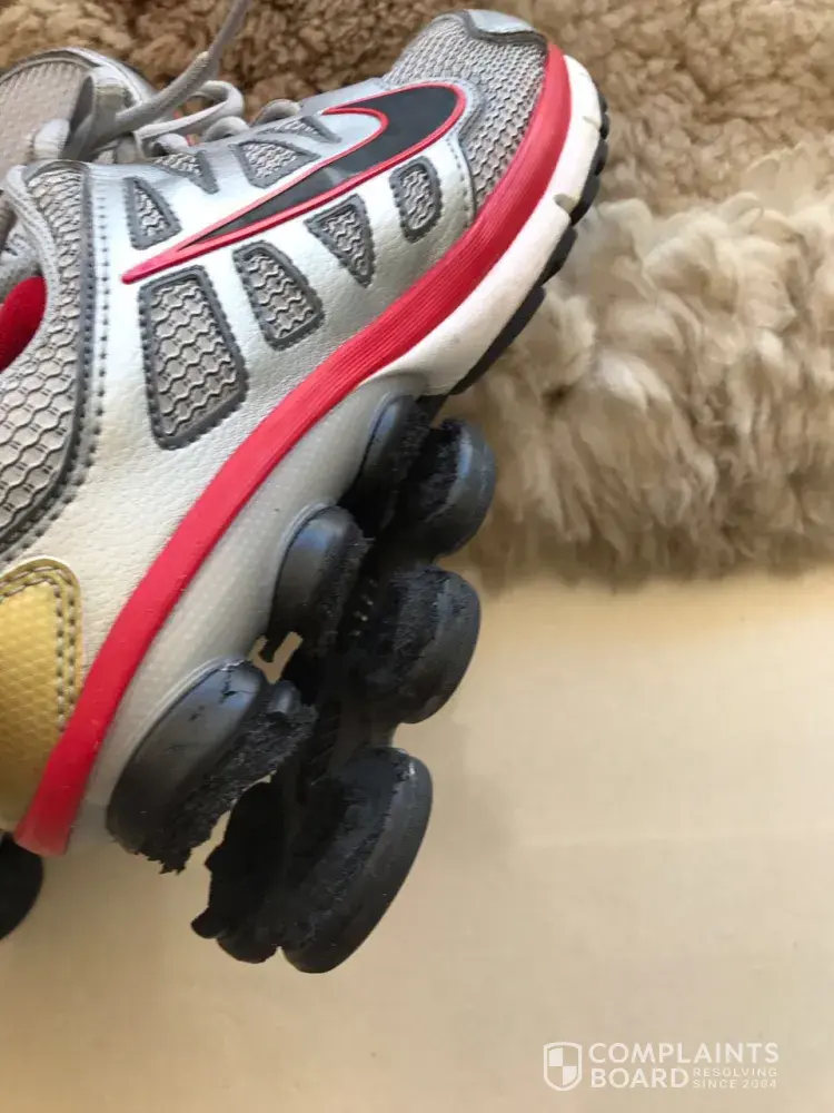 Nike nike shox (shoes) are crumbling (peeling) and tearing apart.