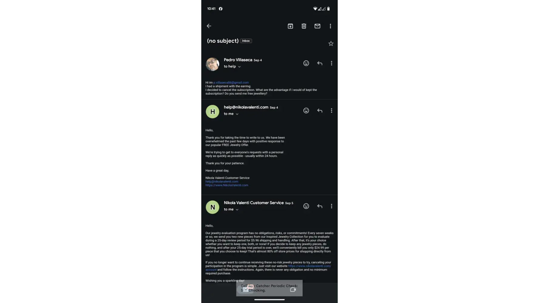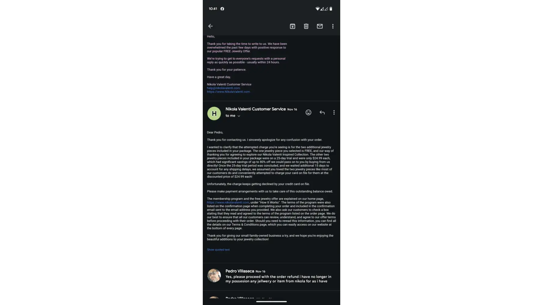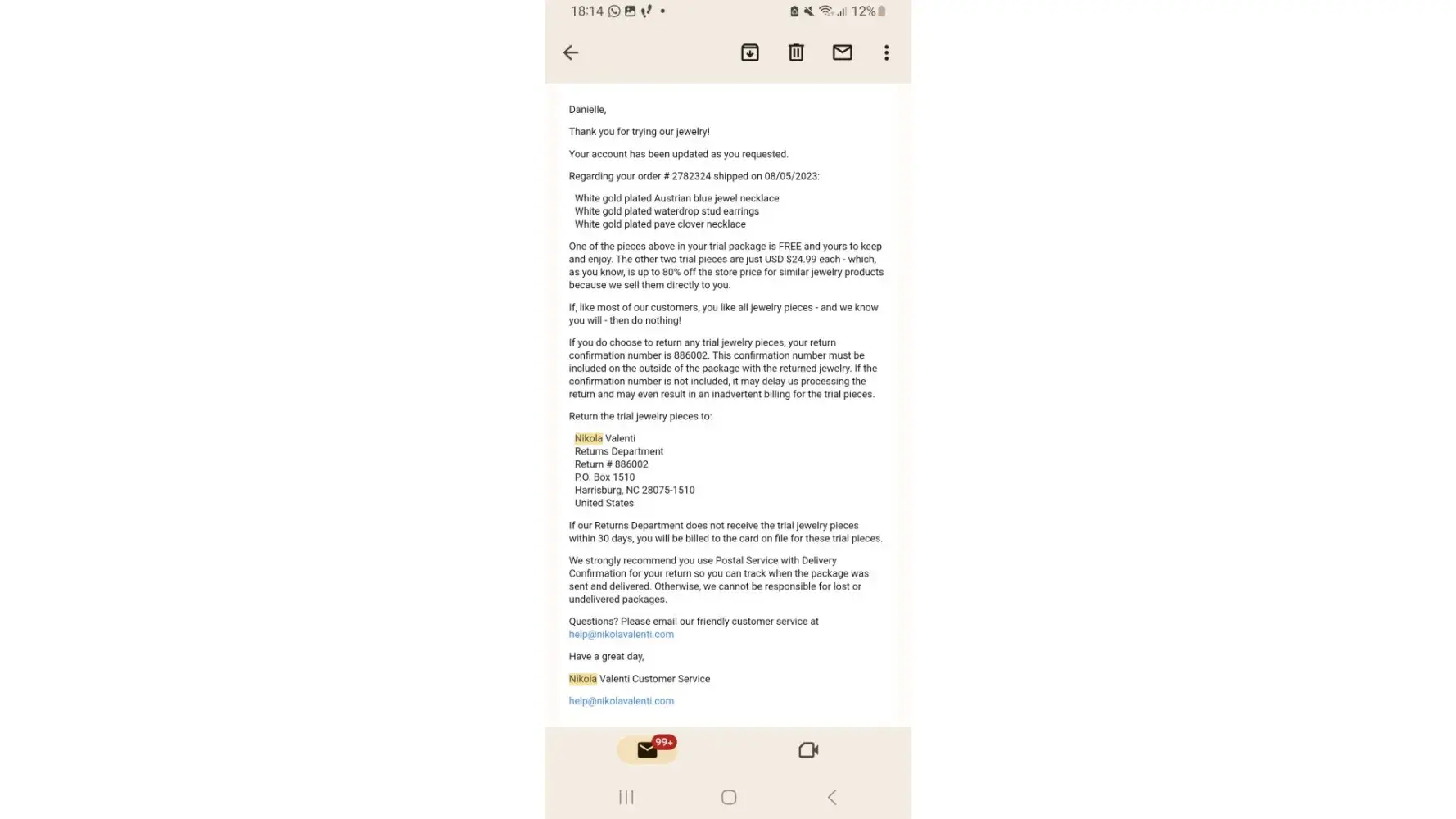April, 6th 2021 Through PCH (Publisher Clearing House) I ordered an item from PCH and a add came up as an additional prize. A necklace for $1.46 I accepted. I then received a email that included 2 other pieces that were not mentioned at time I accepted the necklace. I was informed that I would receive them for $24.99 a piece (ear rings and another necklace) I tried to contact Nikola Venti via email to decline. To no avail. Now I have received them, and still cannot get in contact with them to return what I had no idea I was receiving in the first place. The web address is not accepting any of my information. Order#XXXXXXX Customer #XXXXXX Tracking #XXXXXXXXXXXXXXXXXX They absolutely will not accept my information. I am completely frustrated. I'm afraid, if they are this so hard up for business, they may steal any information they have on me. Please help. For God's sake just check them out. How am I supposed to down load off PCH email?