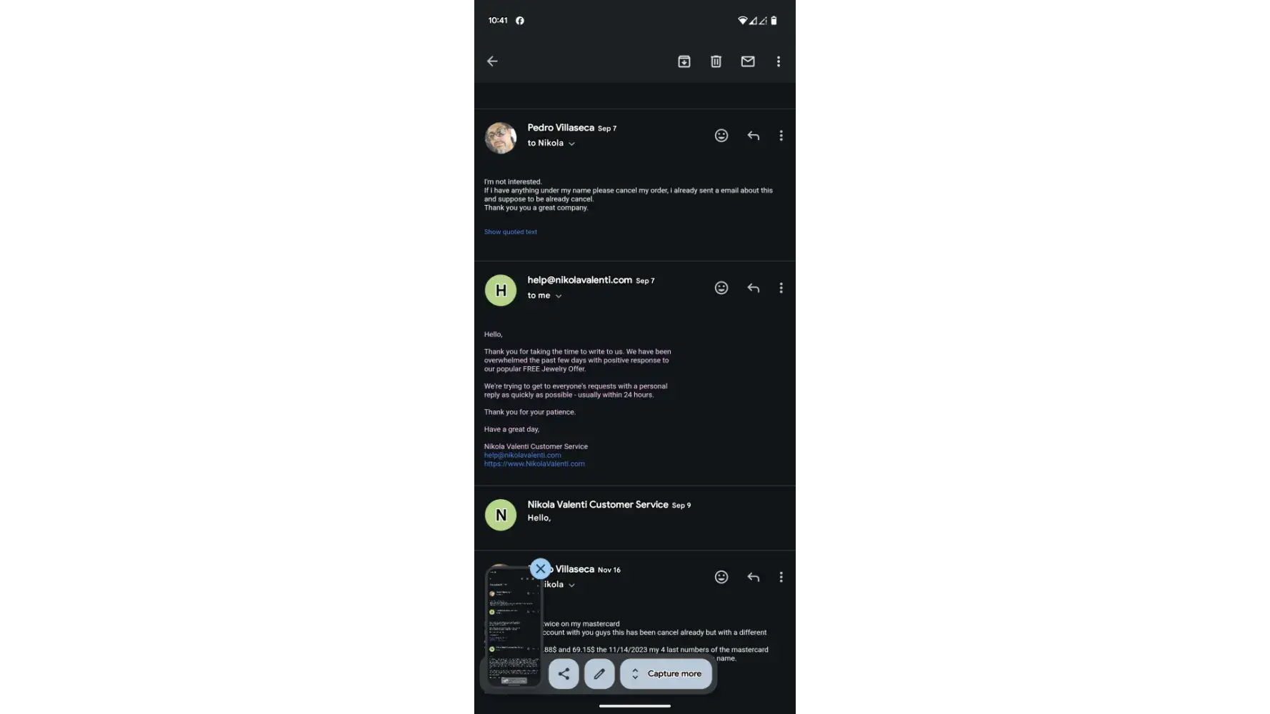I saw Nikola Valenti's ad on Facebook for a free piece of jewelry. I've seen several others about the free jewelry as well. A hacker used my friends first and last name as well as her address and used my email address and credit card information. I called once about a refund for around $54 if I remember. They want their jewelry back but I want my money back. Thats not how that works. I was cheated out of my money and now I have a negative balance in my account. I have canceled the account but they also charged me a shipping fee of like $5 something dollars. They are a scam and a fraud. I called the customer service number today and she was very rude. I do not like her attitude. I do not have a name. She accused my best friend of signing up for the account when she did not. At this point I want to pursue legal action against this fraud company