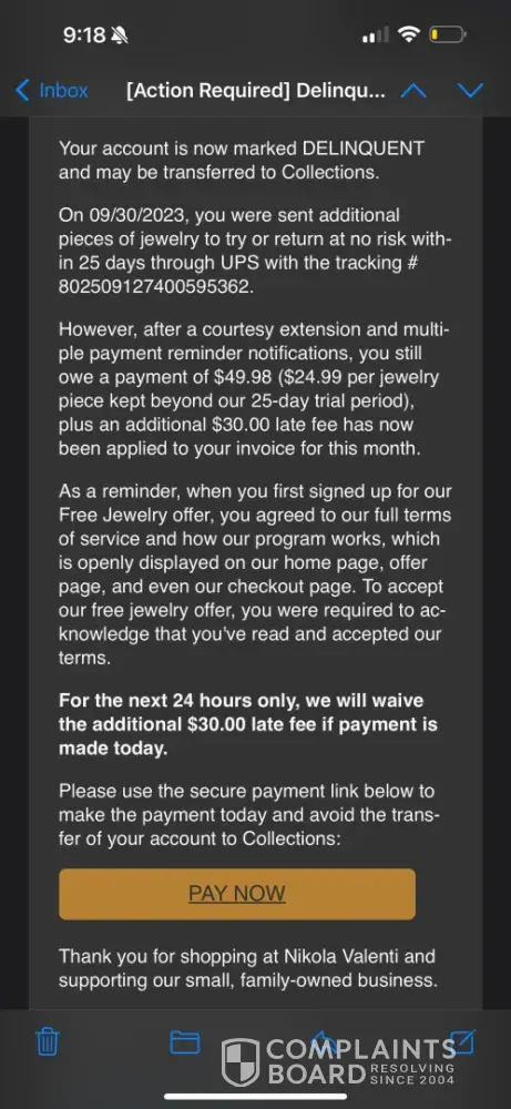 Returned undesired jewelry and am still being billed monthly I ran across an Internet ad for Nikola Valenti jewelry and decided to try their "25-