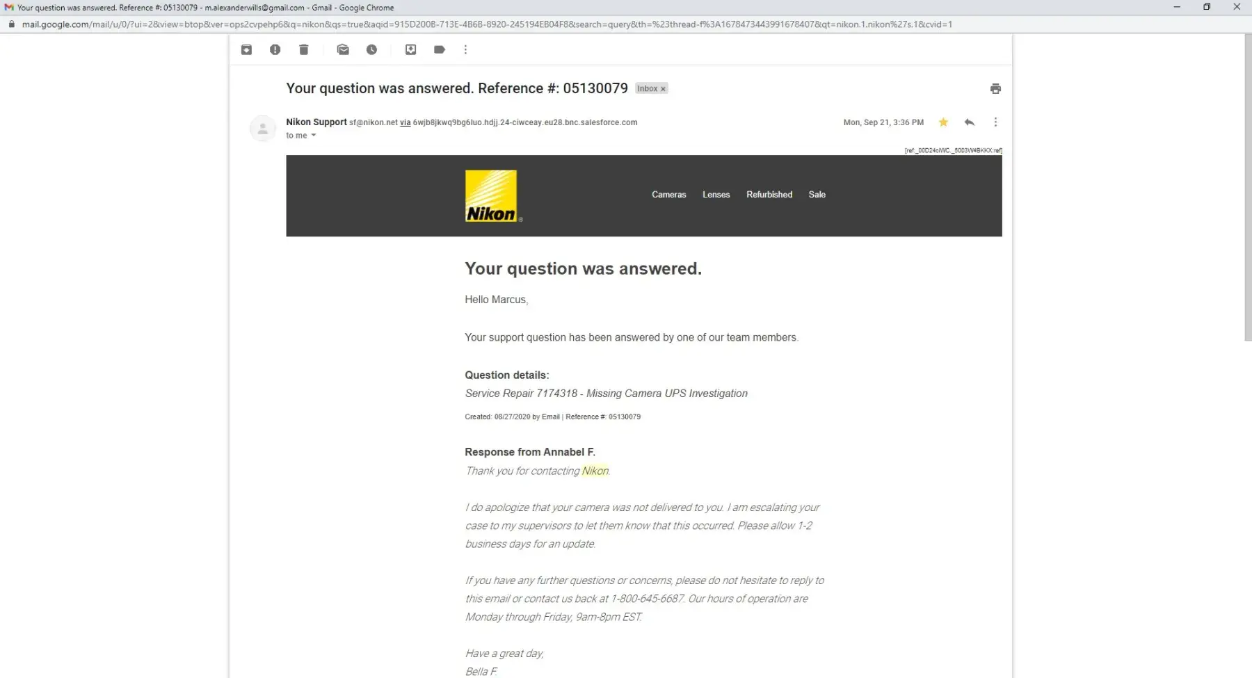Further note that each and every email stated: Please allow 1-2 business days to receive an update. This is fallacious for two reasons. I never received any Nikon generated updates, and certainly not in 1-2 business days.