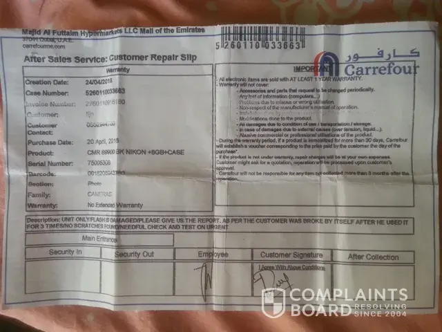 I purchased a Nikon camera ( CMR S9900 ) on above mentioned date through NBD credit card for Aed 999.and made 6 months 0% instalment plan with the bank. Now i want pay to bank 250 dhs to cancel this instalment plan. The salesman explained and showed me the usage of product with demo piece.( but he not suggested me to check the new piece damage or not after the payment ) I opened the camera used 2 days 3 times. Unexpectedly flash broke itself. and not happened from my side by misuse and there is no scratches or no other mistakes to prove that its happened from my side. I informed to customer service mall of emirates carrefore where i purchased it. they told me to bring back and will return the money to your credit card or purchase other product equal to 999 dhs or more than 999 dhs. i suggested to return money to my credit card.