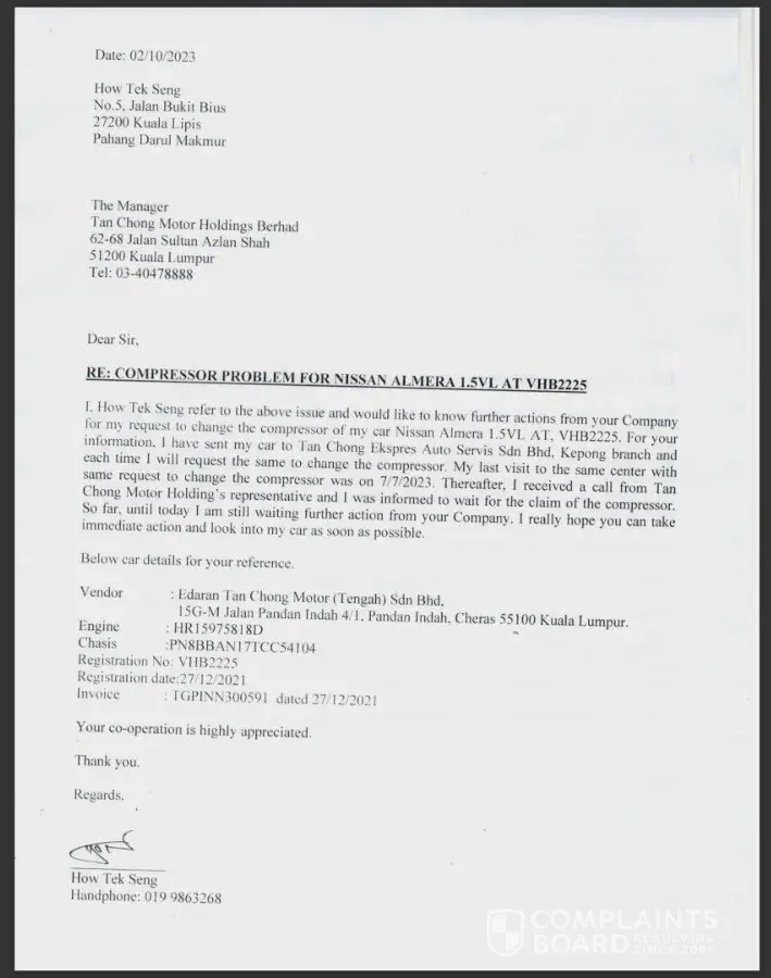I refer to our email dated 2nd October 2023 sent to customer service department of Tan Chong Ekspres Auto Service Sdn Bhd (Kuala Lumpur, Malaysia) in relation to our request to change air compressor of our car Nissan Almera 1.5VL AT as there was very obvious air compressor noise since we bought the car in Dec 2021. We were disappointed to receive an email dated 9th October 2023 from customer service of Nissan Malaysia stated that our request has been rejected due to the noise of the Air condition system is within the specification and the said part is still in good functioning condition.
