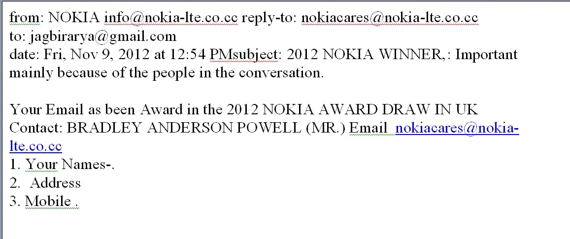 I got recieve email in 04/11/2012 or 09/11/2012 from nokia atm promo uk your email [protected]@gmail.com won-1000000gbp dear luky winner your scfn: gwk/15333/025648/03uad batch :241/202/ball youe email address attached to the ticket no-1001-[protected]-2285 with serialno-8888/03 drew from the luck emails-[protected]-12-36-50 - and security file no - gwk/4578/789834/746yu won amount - 100000gbp your total amount 19 million gbp your customs charge 27000 rupies and your winning parcel registration-gwk/4578/789834/74y your sincerely promotion cordinating center nokia co-operation uk so you sent your complete information on [protected]@msn.com isent my complete information name - bhagwat singh lodhi s/o jamana prasad lodhi age-30 mobile no-[protected] my winner email [protected]@gmail.com won amount - 1000000gbp add-vil/post-keeratpur teh-silwani distt-raisen mp india pin-464886 I request for nokia atm promo uk m won amount 1000000gbp to transfer my sbi acount my sbi account state bank of india branch silwani raisen mp branch code-0544 account holder - bhagwat singh lodhi my saving a/c no-[protected] so please my won amount transfer my sbi account this is request diplomat r benjamin dickie and nokia co opreation uk andlottry cameti please my won amount-1000000gbp to transfer my sbi account thank s your faithful bhagwat singh lodhi