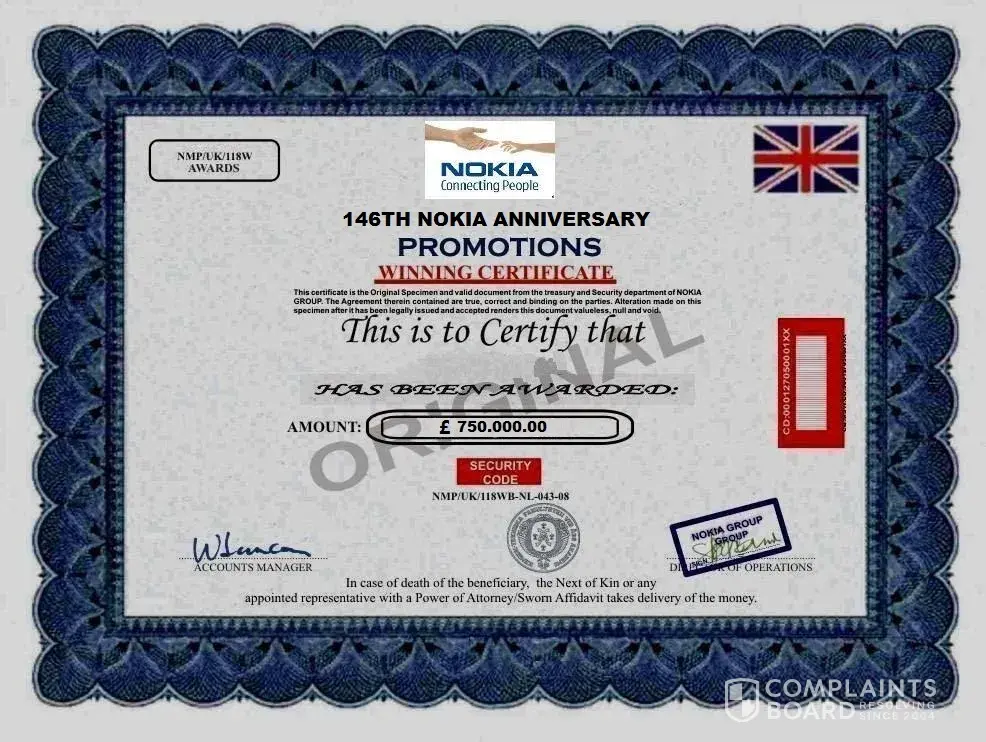 We use this medium to congratulate you as one of our lucky winner of & pound;750, 000 gbp and a nokia phone (n9) worth rupees 25, 000 inr in this nokia promotion 2013. this promotion is held to eradicate poverty and to advertise our new products at the nokia co-operations.