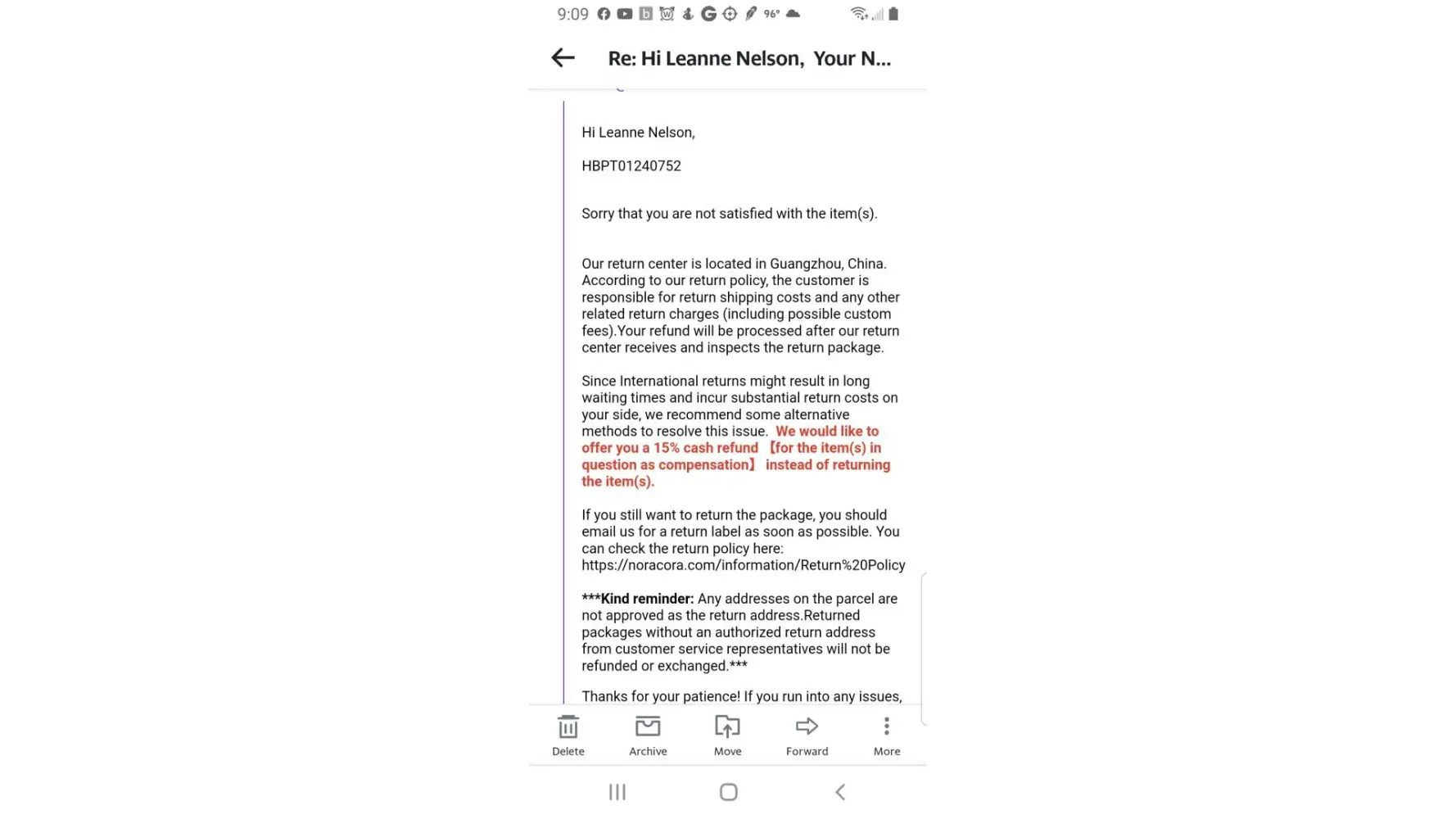 Since International returns might result in long waiting times and incur substantial return costs on your side, we recommend some alternative methods to resolve this issue. We would like to offer you a 15% cash refund 【for the item(s) in question as compensation】 instead of returning the item(s).