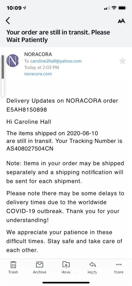 I have placed an order with Noracora website May13, 2020 worth $185.00 and up to this time I am still waiting for my order to come in. I checked the tracking updates and it has not been updated since May 26. I am aware that I can no longer cancel the order, but I would like to know what is going on. This is my first experience ordering from this website and I am very disappointed with lack of communication and the lacking progression of my order. I have emailed numerous times but all I get is a computer generated response which is not giving me any update on my inquiries. I just want to get a full refund of my order. (E5A76116167)